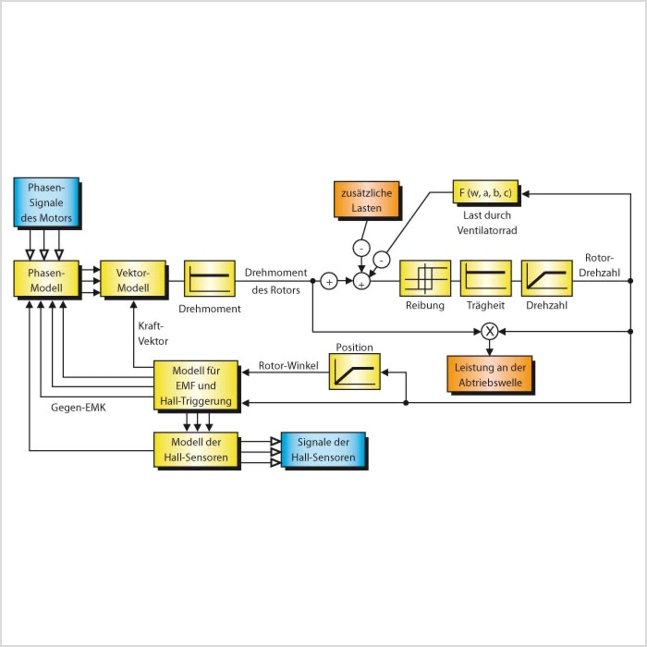 Bei einer Bestromung des Modells mit Konstantstrom kommt es, anders als beim originalen Motor, zu einem mehr oder weniger großen „Zittern“ des Rotors. Neben der Simulation der Motorphasen gemäß dem elektrischen Ersatzschaltbild wird ein Regelmodell für die physikalischen Vorgänge im Motor erforderlich (Bild 2).