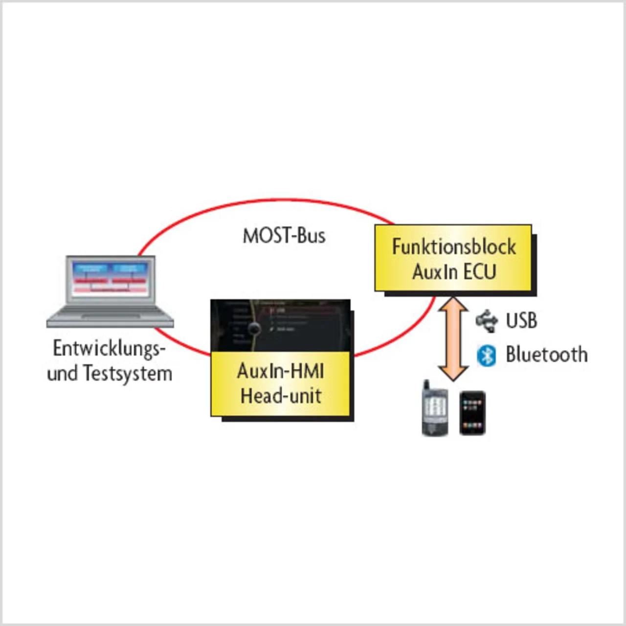 Das Prinzip der modellbasierten Entwicklung wird am Beispiel der Infotainmentfunktion AuxiliaryInput erläutert. AuxiliaryInput steht für die nahtlose und komfortable Integration externer Audioplayer über USB, Bluetooth oder einen analogen Audio-Eingang in das BMW-Infotainment-System. Die Steuerung des externen Geräts erfolgt für den Anwender in gewohnter Weise über das BMW iDrive, wobei die BMW-Head-unit im MOST-Ring die Eingaben des Nutzers an den MOST-Funktionsblock AuxIn sendet.