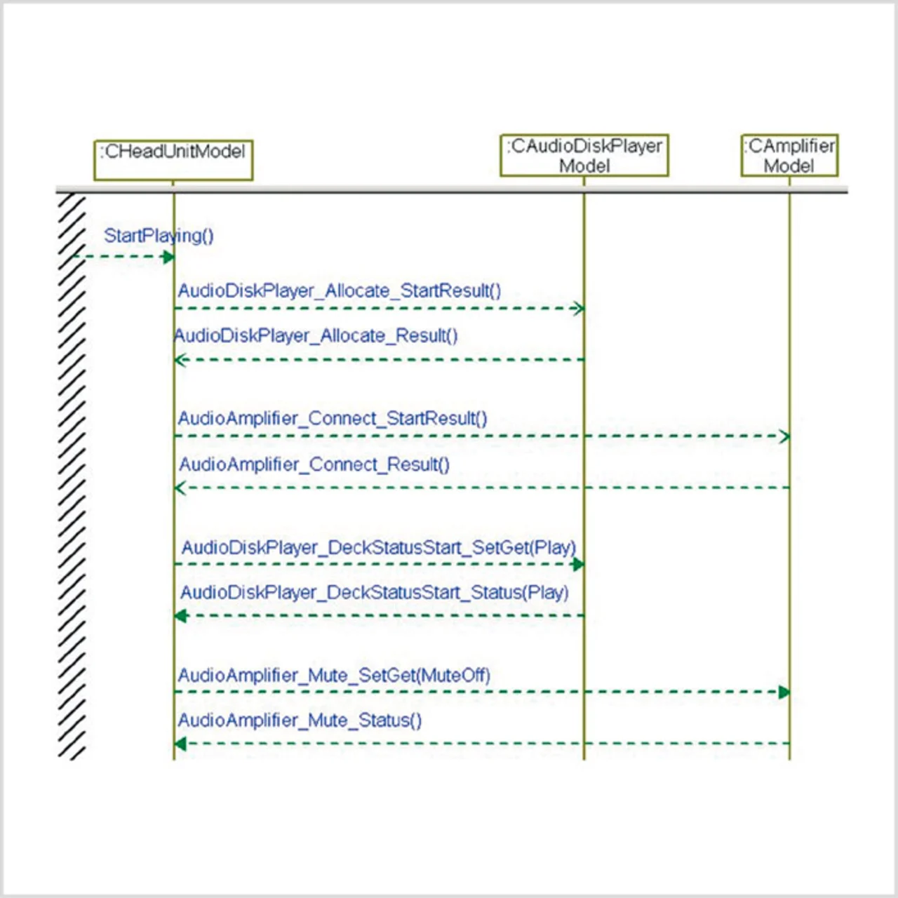 Das ausführbare Modell ermöglicht eine Überprüfung der spezifizierten Funktion durch einen Test an einem virtuellen MOST-Ring in einer Simulationsumgebung. Verhält sich das Modell nicht wie erwartet, bietet sich bereits in dieser frühen Phase die Gelegenheit, die Spezifikation anzupassen. Zudem ergänzen aus dem Modell generierte und damit plausible MOST-Sequenzen, die das Kommunikationsverhalten der Komponenten korrekt beschreiben, das Lastenheft der finalen Spezifikation. Diese Sequenzen werden generiert, indem man verschiedene Anwendungsfälle mit dem Controller- und Funktionsblockmodell durchspielt und dabei die Kommunikationsabläufe auf dem virtuellen MOST-Ring aufzeichnet (Bild 4).