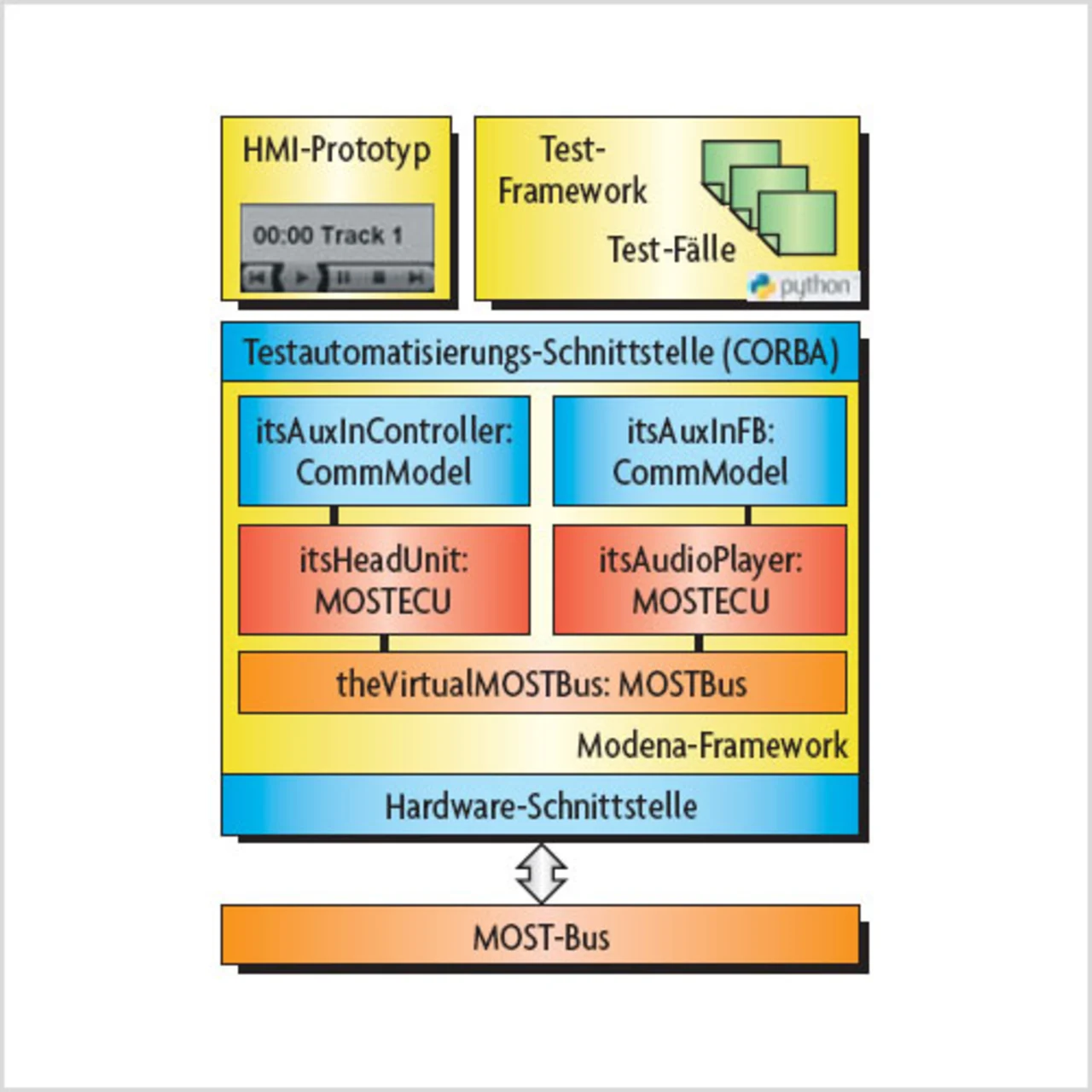 Das bei BMW eingesetzte Test-Framework basiert auf Python und nutzt die freie CORBA-Implementierung omniORB. Die Bibliothek wxPython ermöglicht die Entwicklung einer grafischen Benutzeroberfläche mit abgestimmtem Inhalt auf einen gegebenen Funktionsblock. Diese integriert sich in eine Standardoberfläche, die allgemeine Funktionen wie etwa die Kontrolle des MOST-Rings erlaubt. Über die grafische Nutzeroberfläche, die letztlich einen Prototyp der BMW iDrive-Benutzerschnittstelle darstellt, kann das Modell konfiguriert und ausgeführt werden. Dabei ist sowohl ein manueller Testbetrieb als auch eine automatisierte Ausführung von Python-Skripten möglich. Das Verhalten der Steuergeräte wird dabei genauso geprüft wie die Korrektheit der MOST-Sequenzen. Abweichungen werden automatisch erkannt und in einem Log-File zur Fehleranalyse gespeichert.