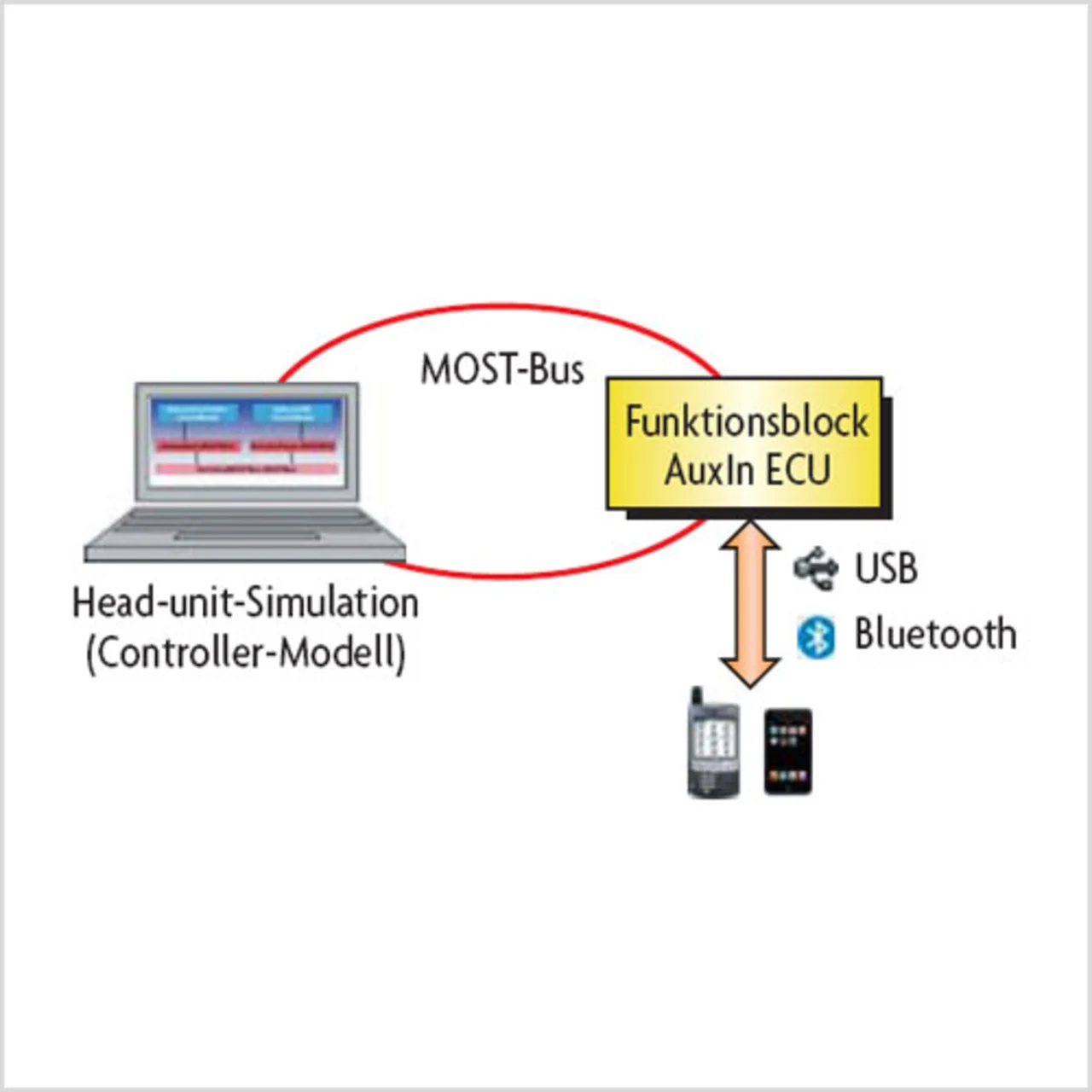 Erfordert ein Steuergerät eine neue Headunit-Funktion, so lässt sich auch diese simulieren und im Test verwenden. Zum Komponententest diente im konkreten Anwendungsfall eine Simulation der Head-unit, welche neben neuen Funktionen auch die grundlegenden MOST-Funktionsblöcke, zum Beispiel Netzwerk- und Powermanagement, als wiederverwendbare Bausteine enthält. Dadurch erlaubt sie Betrieb und Test eines Steuergerätes, das den MOST-Funktionsblock AuxIn implementiert, ohne den Anschluss weiterer echter MOST-Ringteilnehmer (Bild 5).