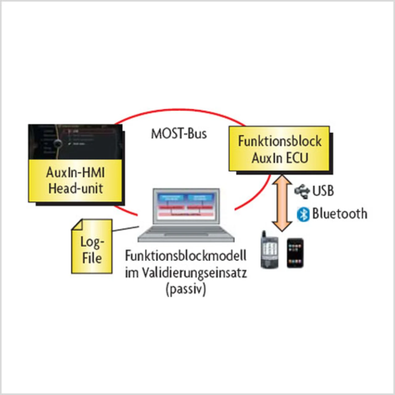 Das Blockmodell einer Funktion enthält das vollständige Sollverhalten. Daher liegt es nahe, die darin enthaltenen Informationen zur Validierung der Kommunikationsabläufe während der Tests zu nutzen. Hierzu wird das Funktionsblockmodell so modifiziert, dass es möglich ist, das beschriebene Sollverhalten im Modell mit den tatsächlich auf dem MOST-Ring gesendeten Nachrichten zu vergleichen. Das Funktionsblockmodell und das reale Steuergerät mit der AuxiliaryInput-Funktion werden in der Validierungsphase parallel betrieben. Im Gegensatz zur Simulation sendet das Funktionsblockmodell aktiv keine Nachrichten mehr, sondern empfängt stattdessen passiv die gesendeten MOST-Nachrichten des realen Steuergeräts und erkennt durch einen Vergleichsalgorithmus automatisch Abweichungen von der Spezifikation (Bild 6).