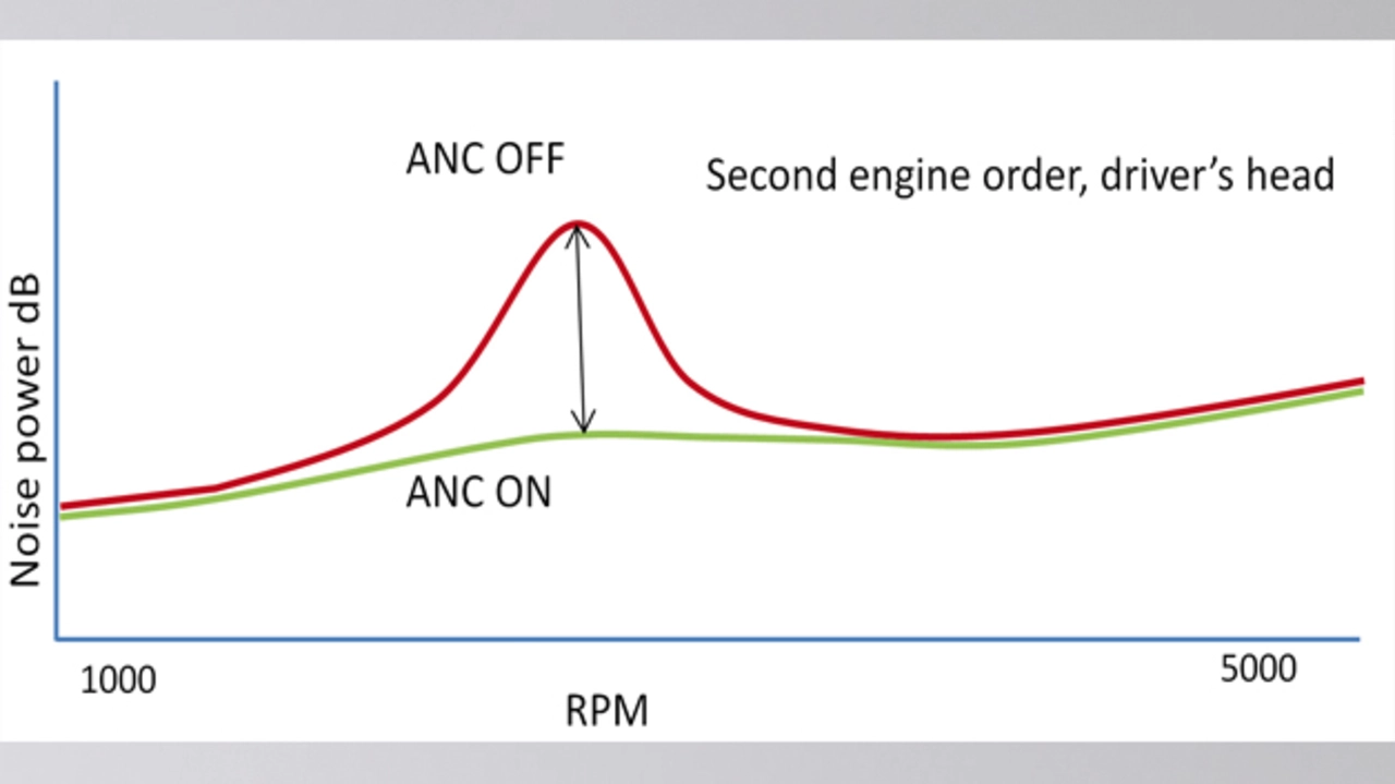 Die gute Nachricht: Diese Maßnahmen senken tatsächlich den Kraftstoffverbrauch. Allerdings verursachen sie auch oft unangenehmen Lärm im Fahrzeug. Dieser Lärm – ein Brummen oder Dröhnen direkt aus dem Motor – ist durch eine oder mehrere niederfrequente Töne unterhalb 150 Hz gekennzeichnet und er kann dazu führen, dass Fahrer, die ihm längere Zeit ausgesetzt sind, schneller ermüden. Hier bietet sich Technologie zur aktiven Lärmkompensation (Active Noise Control; ANC) als Lösung an (Bild 1).