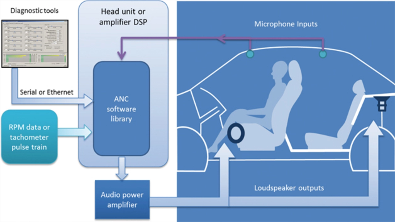 Damit ein ANC-System mit solchen Veränderungen zurechtkommen kann, benötigt es Echtzeitdaten über den Motorbetrieb, insbesondere Drehzahldaten, sowie Messpegel von einem oder mehreren Mikrofonen in der Nähe der Köpfe des Fahrers und der Fahrgäste (Bild 2). Anhand der Echtzeit-Motordaten bestimmt das System die Frequenzen, die es unterdrücken muss, und die Mikrofone überwachen den Lärmpegel in der Fahrgastzelle, damit sich das System auf die ständigen Veränderungen der akustischen Eigenschaften des Fahrzeugs einstellen kann.