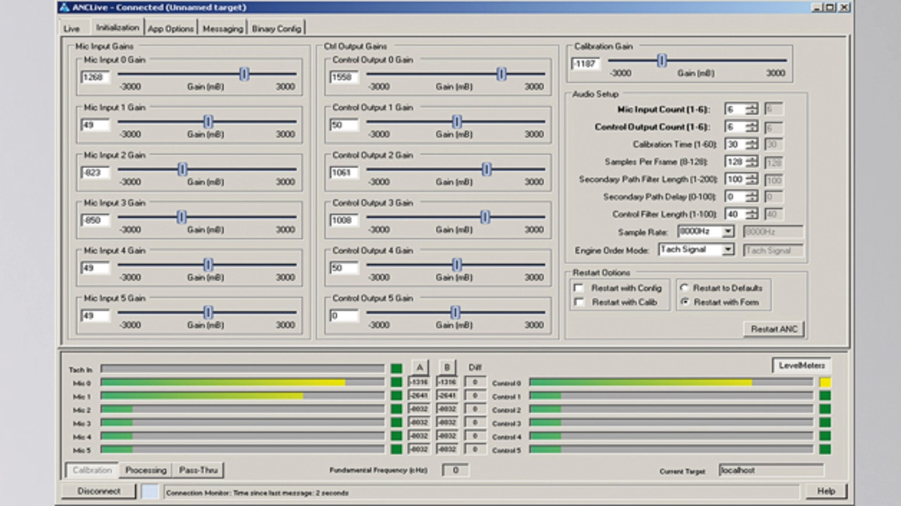 Sobald ein Auto mit Mikrofonen und Lautsprechern ausgestattet ist, muss auch das ANC-System getuned und kalibriert werden, um unter verschiedenen Bedingungen immer die optimale Lärmreduktion zu erreichen. Das Tuning der einzelnen Parameter sollte sowohl per Rollenprüfstand als auch bei Tests auf der Straße durchgeführt werden. Tests auf Rollenprüfständen ermöglichen es, die genauen Bedingungen für jede Fahrleistung und jede Geschwindigkeit einzustellen. Tests auf der Straße schaffen dann den Abgleich mit Realbedingungen und Einflüssen, die in einer kontrollierten Testumgebung möglicherweise nicht simuliert werden können: externer Verkehr, geöffnete und geschlossene Fenster oder auch verschiedene Straßenbeläge und das damit verbundene Fahrgeräusch. Der Tuningprozess ist aufwendig und kann sich über mehrere Monate erstrecken. Eine interaktive Messplattform wie hier dargestellt (Bild 3) kann sich aber mit dem Testfahrzeug über einen Serial- oder Ethernet-Port verbinden und die Echtzeitanalyse von Daten erleichtern. Das kann den Zeitaufwand für Tuning und Kalibrierung in erheblichem Maß reduzieren.