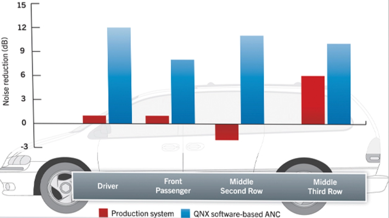 Um die Leistung von softwarebasierter aktiver Lärmkompensation zu beurteilen, hat QNX in einem Test die Schallminderungsleistung der eigenen ANC-Softwarebibliothek mit einem Hardwaresystem eines beliebten Minivans Baujahr 2012 verglichen. Der Minivan nutzt VCM (Variable Cylinder Management) zur Senkung des Kraftstoffverbrauchs und ist mit einem dedizierten, unabhängigen ANC-Modul ausgestattet. Das System verfügt über zwei Mikrofone: eines in der Nähe des Rückspiegels, das andere im Fahrzeughimmel über der dritten Reihe. In der Fahrer- und der Beifahrertür und den beiden Schiebetüren sind insgesamt vier Lautsprecher angeordnet; im Kofferraum befindet sich ein Subwoofer.