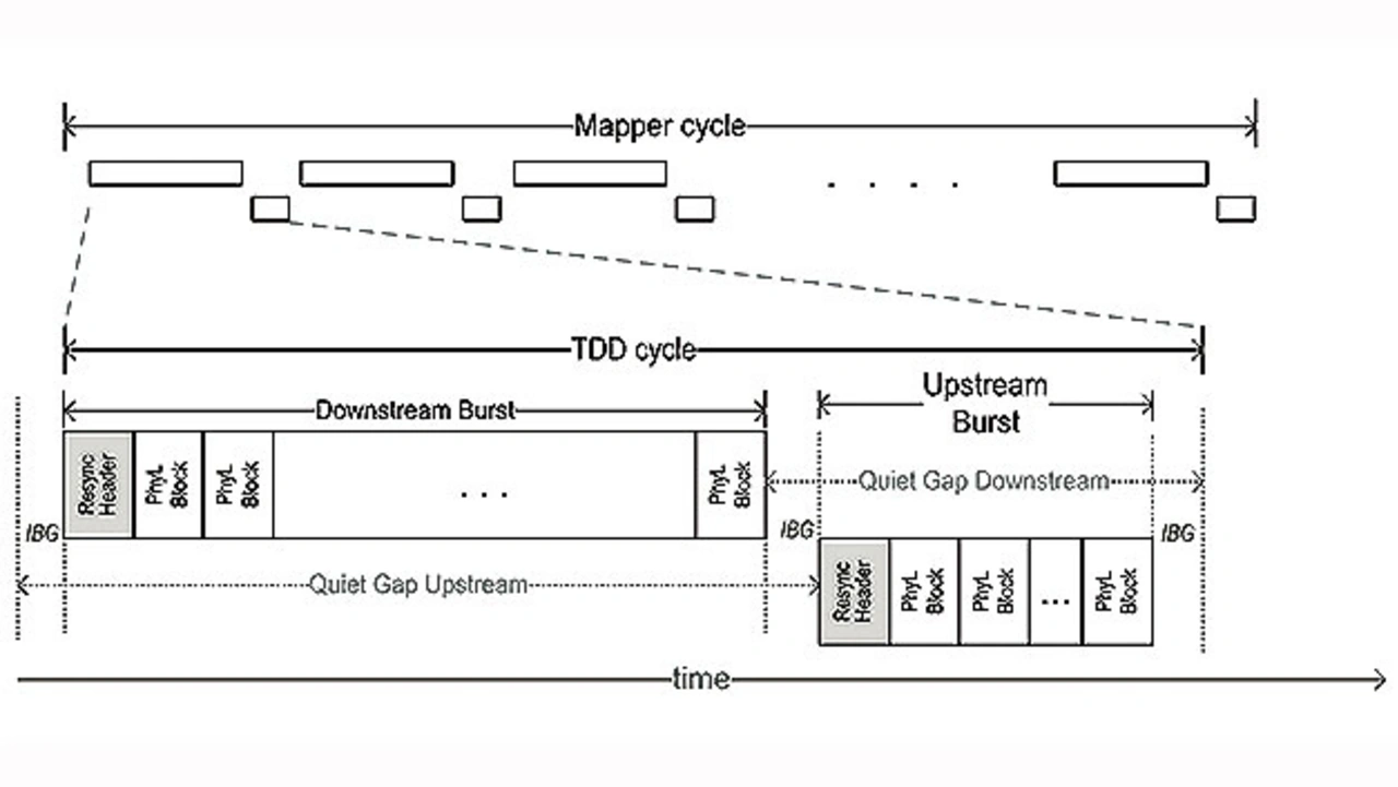 ASA Motion Link verwendet Time Division Duplexing (TDD), um Downstream-Daten mit hoher Bandbreite und Upstream-Datenverkehr mit niedriger Bandbreite zu übertragen (Bild 1). Diese Technik reduziert die Größe und Komplexität der Empfängerimplementierungen erheblich. Die Verringerung der Komplexität wird dadurch erreicht, dass sich die Signale in Vorwärts- und Rückwärtsrichtung zu keinem Zeitpunkt überlappen. Das wiederum erleichtert die Wiederherstellung des Signals auf der Empfängerseite.