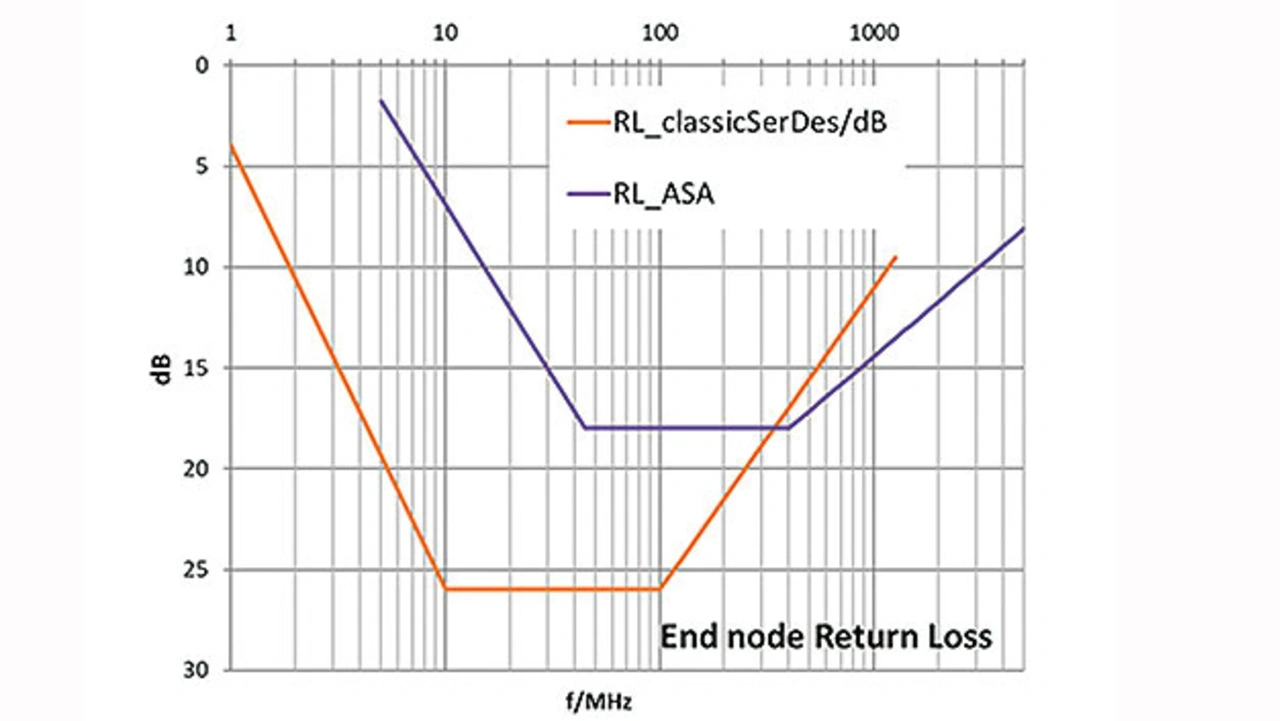 Das TDD-basierte Übertragungsschema führt im Vergleich zu bestehenden SerDes-Lösungen zu deutlich geringeren Rückflussdämpfungs-/Echo-Grenzwerten (RL) an den Knoten (Bild 2). Da eine Einheit entweder Daten sendet oder empfängt, werden die empfangenen Daten nicht durch Echos der gesendeten Daten beeinträchtigt.