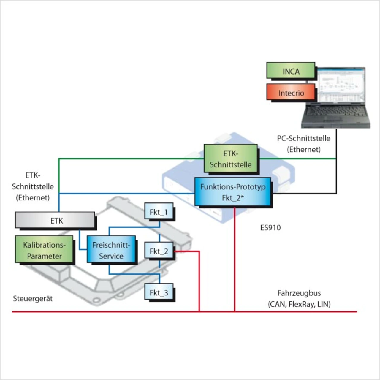 Hier hilft die Bypass-Technik entscheidend, die Funktionsentwicklung zu beschleunigen, indem das Funktionsmodell auf einem Experimentiersystem ausgeführt wird. Das Experimentiersystem wird dazu über eine Bypass-Schnittstelle mit der Software im Steuergerät verbunden. Dies kann z.B. über eine 100-Mbit/s-Ethernet-Schnittstelle eines Emulatortastkopfs ETK von Etas realisiert werden [2].