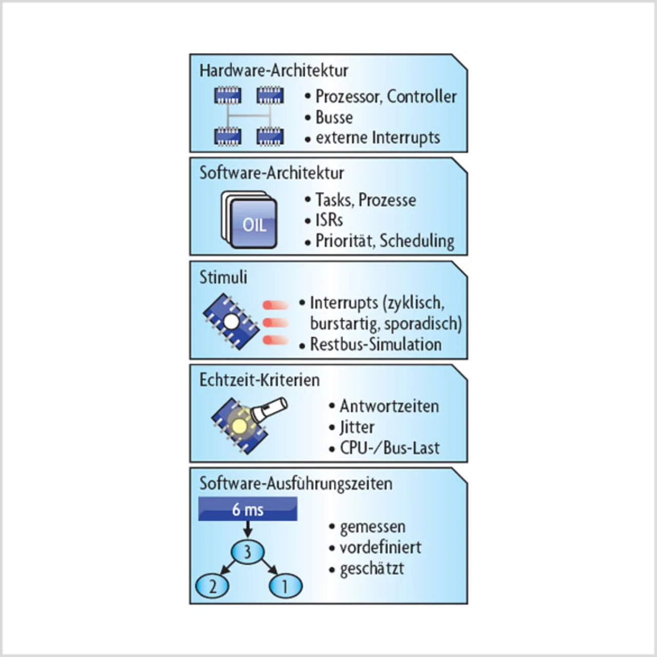 Ausgangsbasis sind die Hardware-Elemente des eingebetteten Systems (Prozessoren und Bussysteme) mit ihren Scheduling-Verfahren, die definieren, wie die Leistungsanforderungen der Funktionen auf diesen abgearbeitet werden. Der Bedarf an Rechenzeit oder Datenübertragungsrate einer Funktion wird als Ausführungszeit und Anforderungsschema – beispielsweise zyklische oder ereignisgesteuerte Ausführung – beschrieben. Im Fall eines OSEK-Steuergeräts werden die Tasks und Interrupts mit ihren Eigenschaften und Abhängigkeiten modelliert. Die Anregungen der Software über Interrupts von außen werden als Stimuli modelliert. Einige dieser Parameter können aus einem OIL-File (OSEK Implementation Language) eingelesen werden. Andere, wie beispielsweise die Ausführungszeiten, sind in der Oberfläche des Modellierungswerkzeugs leicht zu ergänzen.