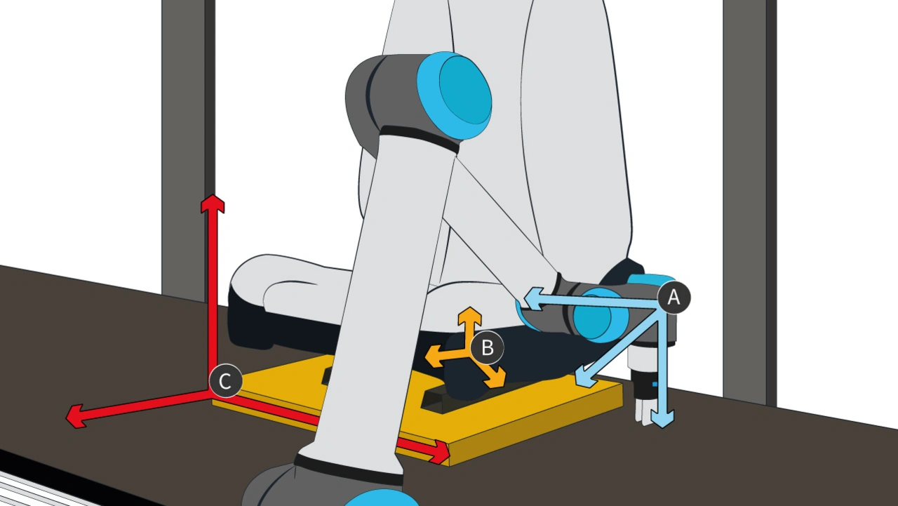 Für den Automatisierungsplatz werden drei Koordinatensystemen zur Positionsbeschreibung verwendet (Bild 2), das Roboterkoordinatensystem TCP (A), das Prüflingskoordinatensystem (B) und das Koordinatensystem des Arbeitsplatzes/Warenträgers (C).