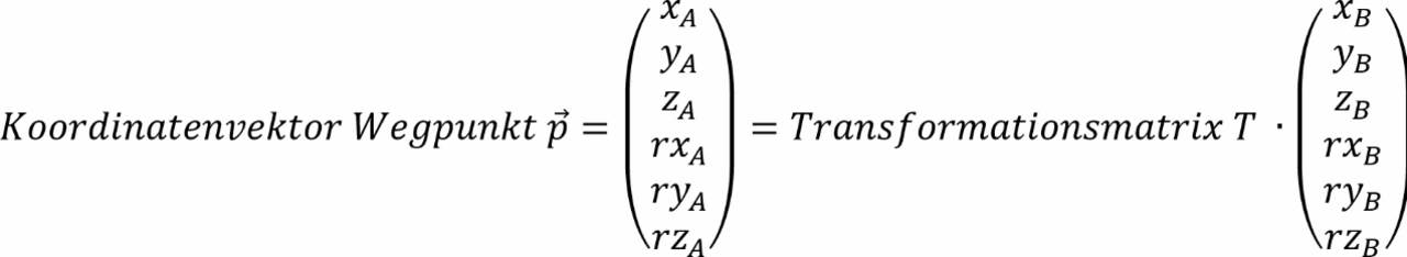 Ziel ist es, die Position eines Merkmals aus dem Prüflingskoordinatensystem B in das Roboterkoordinatensystem A zu überführen, damit in diesem System ein bestimmter Wegpunkt p angefahren werden kann. Wie exakt dieser Wegpunkt (siehe Formel) ermittelt werden muss, hängt von der Applikation ab. So benötigen zum Beispiel Interaktionen mit der Schalterblende eines Autositzes eine höhere Genauigkeit als die Ablage eines Tennisballs in einem Basketballkorb.
