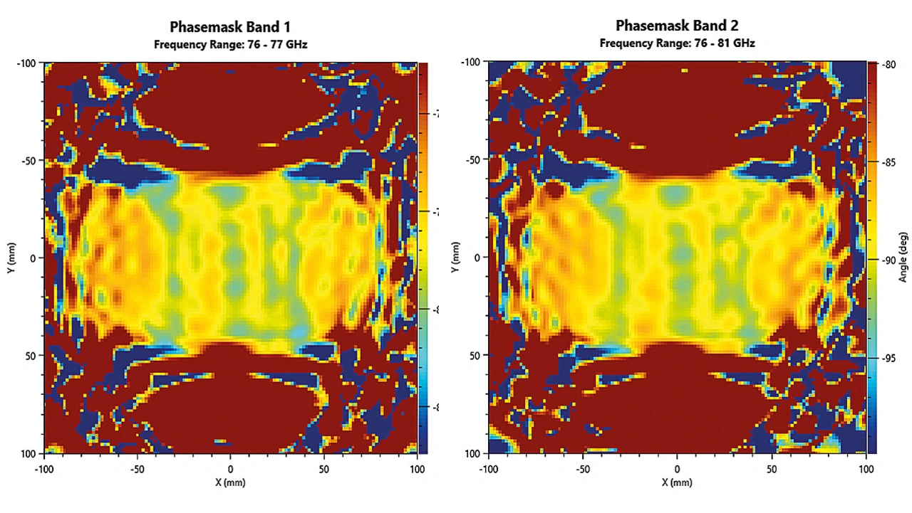 Es ist wichtig, bereits in einem frühen Stadium – bevor das Radom oder der Stoßfänger zur Fertigungsendkontrolle gebracht werden kann – eine Beurteilung der Homogenität der Designs zu ermöglichen. Mit einer zusätzlichen Phasenmaskenoption lässt sich die Transmissionsphase messen. Dadurch kann die Homogenität des Radoms und des Stoßfängers ohne mechanische Bewegung analysiert werden (Bild 3).