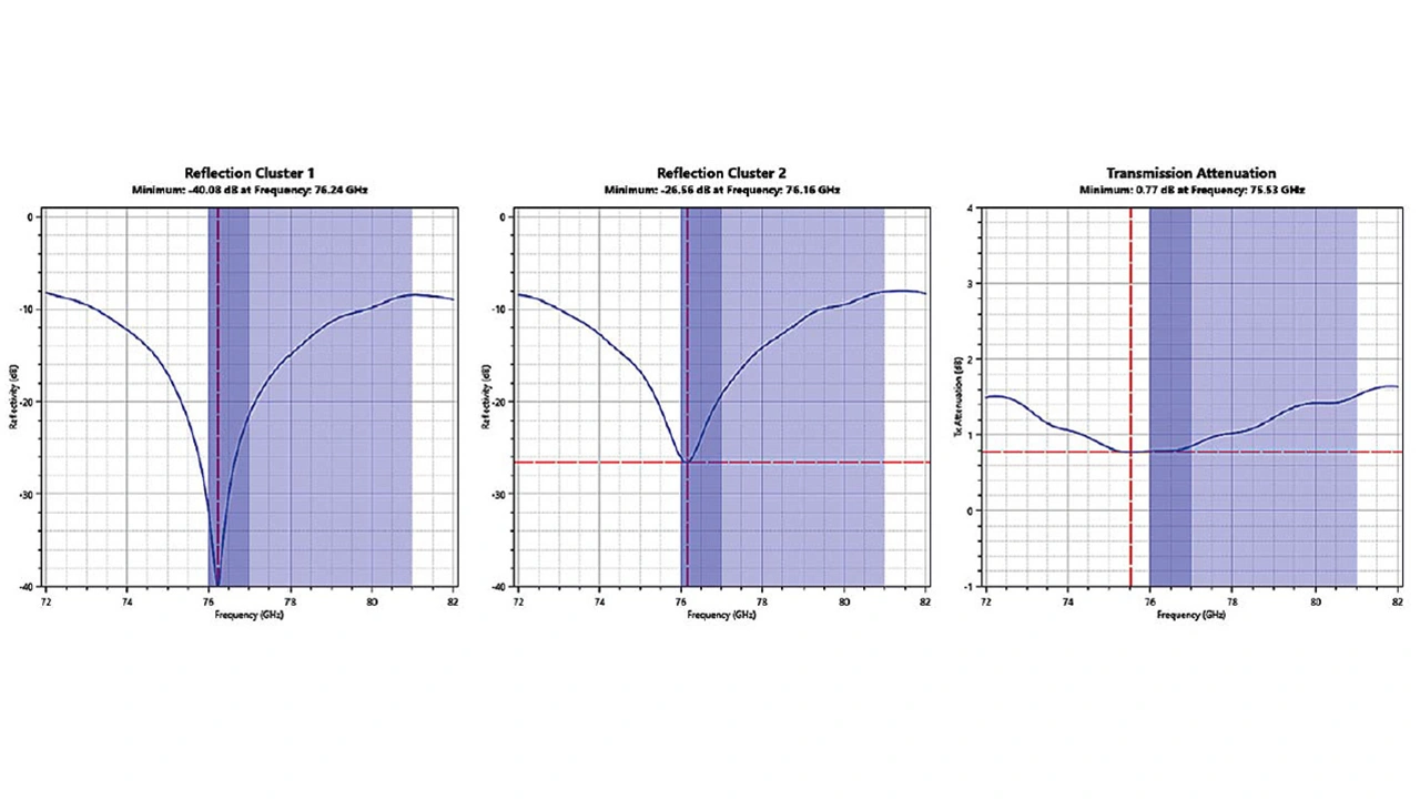 Einige OEMs haben höhere Anforderungen an ihre End-of-Line-Tests. Aus diesem Grund muss die Frequenz für beide Bänder auf den Bereich von 72 GHz bis 82 GHz ausgedehnt werden (Bild 4). Daraus wird der Frequenzgang der Reflexion und Transmissionsdämpfung ersichtlich. So kann die richtige Frequenzanpassung des Materials ermittelt und bei Bedarf die Materialdicke angepasst werden. In der Produktion ermöglicht es das Reflexionsminimum, Fehlanpassungen und Schwankungen zwischen den Prüflingen schnell zu erkennen.