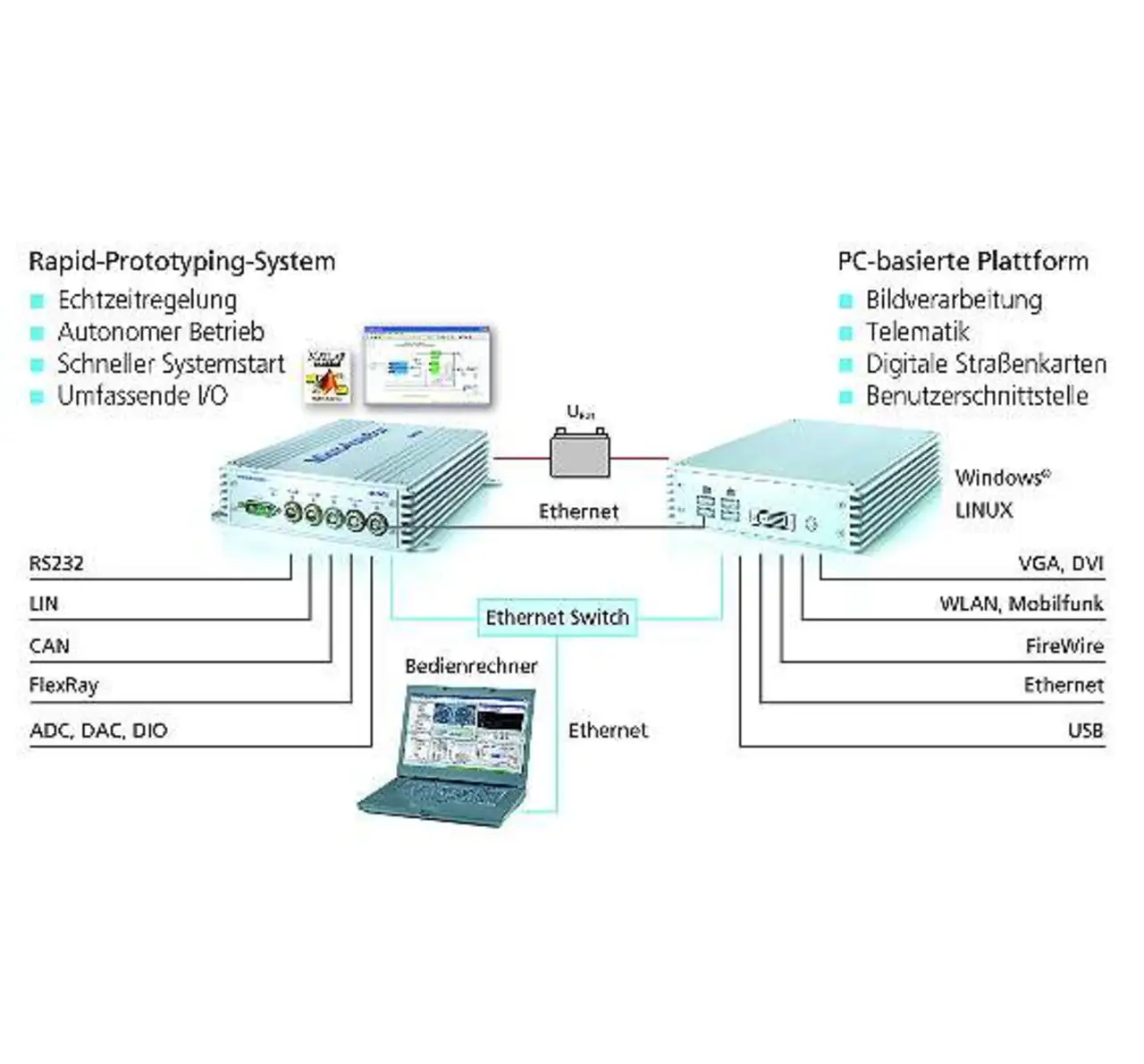 Insbesondere die Automobilindus-trie nutzt diese Rapid-Prototyping-Systeme, um Steuergerätefunktionen direkt im Fahrzeug zu entwickeln und zu erproben. Viele aktuelle Entwicklungstrends in den Bereichen Fahrerassistenz, Elektromobilität, Telematik und Bildverarbeitung stellen neue Anforderungen an diese Entwicklungsumgebungen. Zunehmend kommen als Ergänzung PC-basierte Plattformen zum Einsatz.