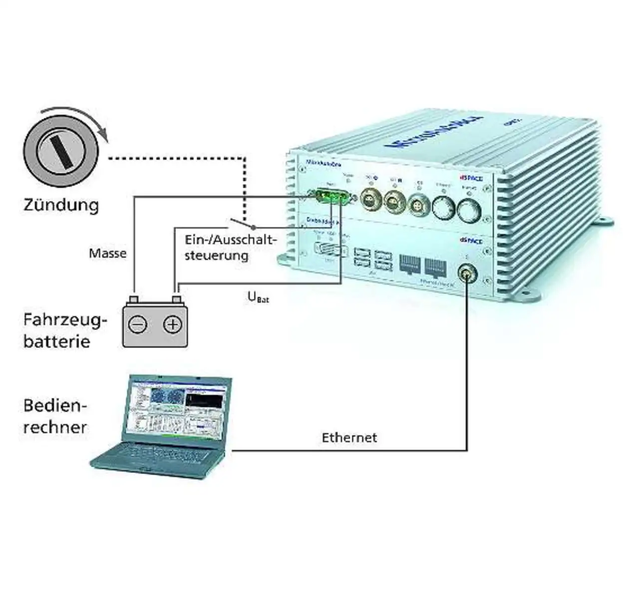 Beispielsweise kann das Gesamtsystem über den Zündschalter im Fahrzeug oder bei Verbindungsaufbau mit dem Bedienrechner mittels Wake-up-on-Ethernet ferngesteuert werden.