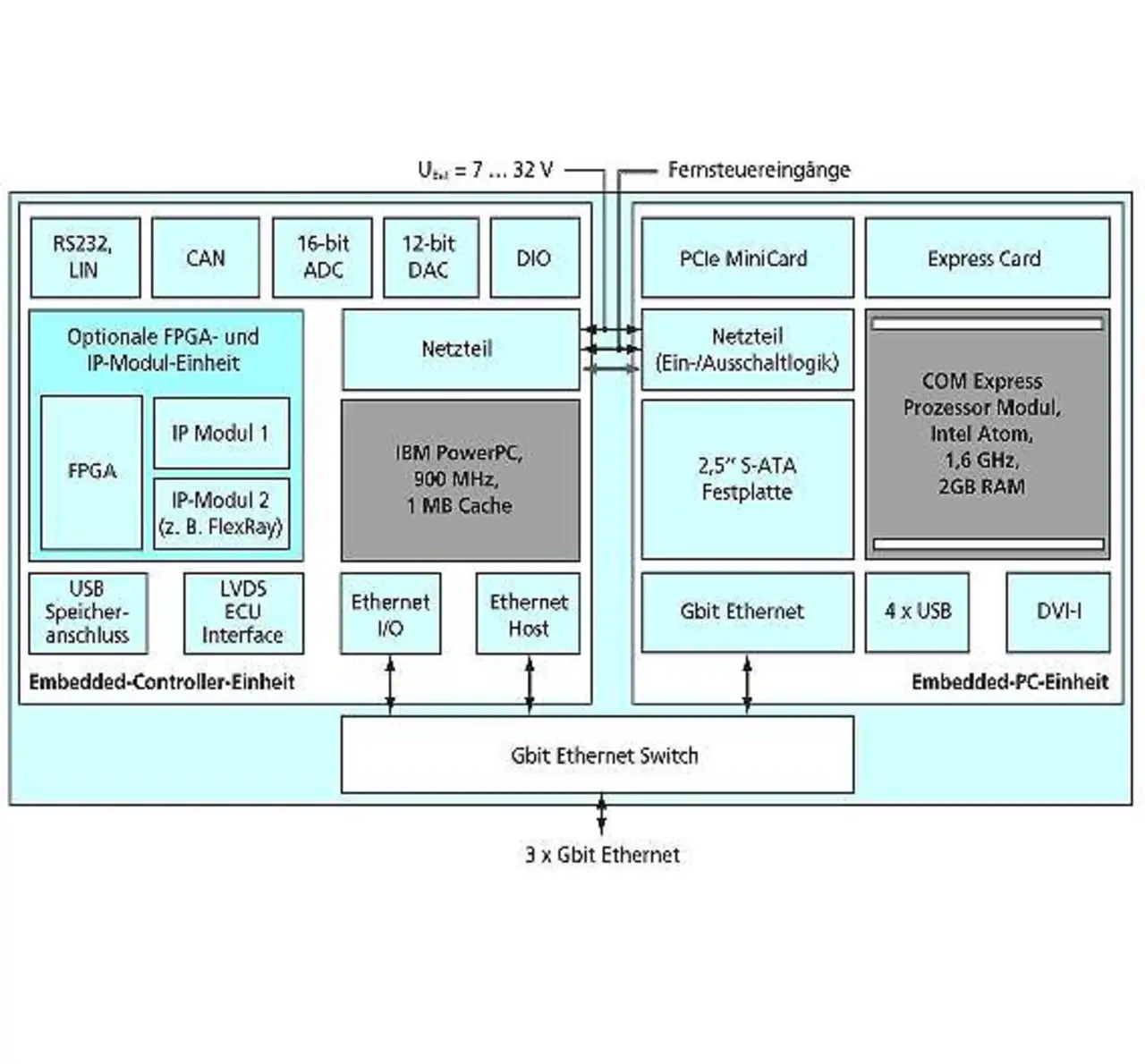 Auf dem Embedded-Controller läuft parallel dazu ein Echtzeitbetriebssystem mit sehr geringen Worst-Case-Reaktionszeiten. Durch den internen PCIe-MiniCard-Steckplatz und den rückseitig zugänglichen Express-Card-Einschub lässt sich die Embedded-PC-Einheit an spezielle Kundenwünsche anpassen und erweitern, zum Beispiel um WLAN, Mobilfunk oder FireWire.