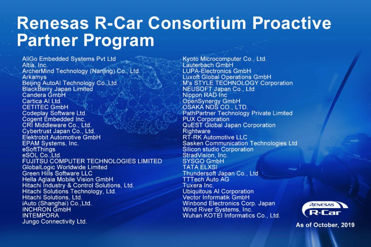 Das 2005 als offene Plattform für den Automobilmarkt gegründete R-Car Consortium umfasst derzeit 252 Partner. Es unterstützt Systementwickler dabei, die Anzahl der Entwicklungsschritte und Kosten für die Anwendungsentwicklung vom Kleinwagen bis zur Premiumklasse zu reduzieren. Wegen der wachsenden Mitgliederzahl des Konsortiums und der zunehmenden Informationsfülle arbeitet Renesas kontinuierlich daran, die Informationsbereitstellung zu vereinfachen.