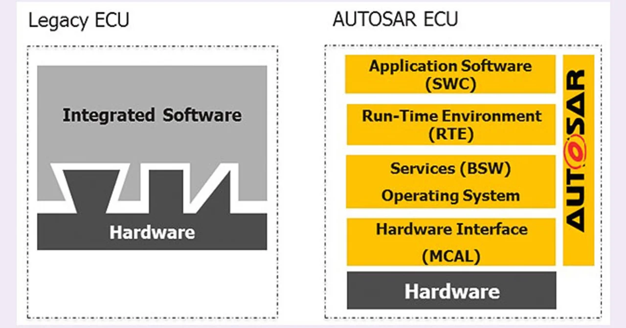 AUTOSAR bietet eine standardisierte Definition für ECU-Schnittstellen und ermöglicht es dem Entwickler, standardisierte, wiederverwendbare Software-Schichten und -Komponenten, die in verschiedenen Automobil-Steuergeräten vorhanden sein müssen, zu spezifizieren. Da der Standard Hardware-unabhängig ist, lässt sich eine klare Linie zwischen der Anwendungs-Software und der Hardware-Plattform ziehen. Der Anwendungsentwickler kann die Details der individuellen Fahrzeugfunktionen in der Anwendungs-Software spezifizieren, ohne dass er sich um die darunter liegenden Software Services und Hardware-Schnittstellen kümmern muss. In der Vergangenheit waren Software und Hardware sehr eng integriert, was die Portabilität und Wiederverwendung behinderte (Bild 1).