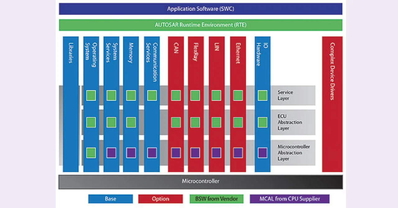 Die AUTOSAR-Software-Architektur entkoppelt die Anwendungslogik von der Hardware und erleichtert so die Wiederverwendung und Portabilität. Die BSW und das Betriebssystem sind mit der Microcontroller Abstraction Layer (MCAL) verbunden. Diese Schicht bietet wiederum Zugang zu den Komponenten auf den Host-Mikrocontroller. Die MCAL ist für jeden Mikrocontroller spezifisch und gewährt dem Betriebssystem und der BSW Zugang zu Komponenten wie digitale I/Os, Analog-Digital-Wandler sowie FLASH- und EEPROM-Support. Bild 4 zeigt die Beziehung zwischen verschiedenen Hardware- und Software-Schichten in einem AUTOSAR-Steuergerät.