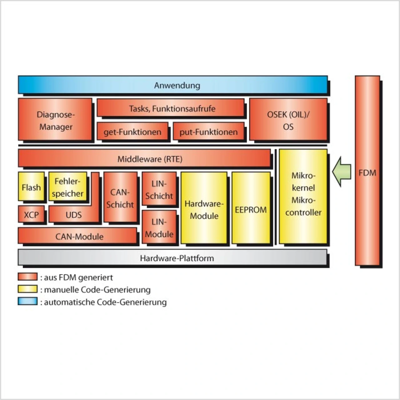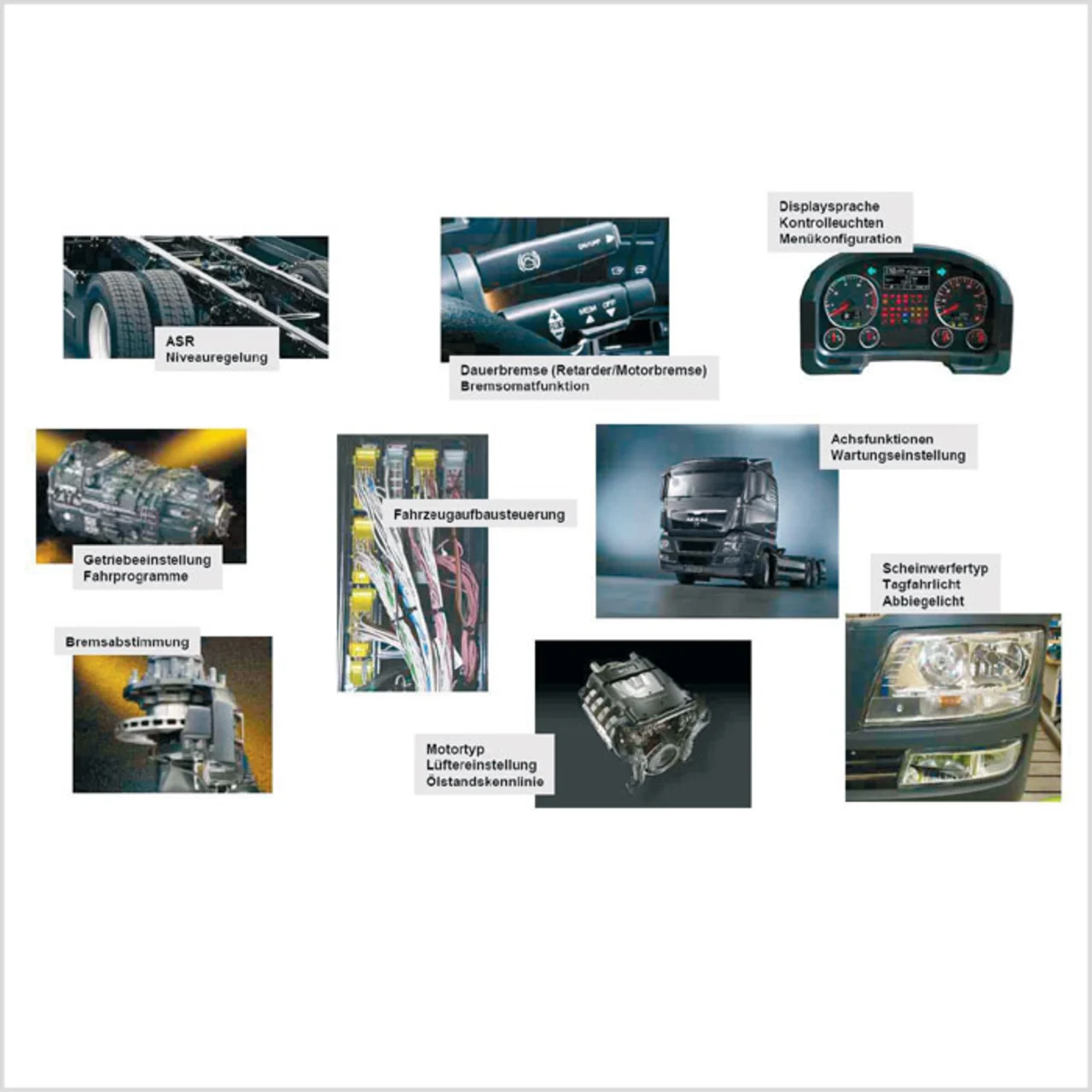 Die Komplexität im Lkw-Bereich resultiert in erster Linie aus der großen Variantenvielfalt. Unterschiedliche Achsformeln, Aufbauten, Bremsen- und Federvarianten erfordern eine hohe Flexibilität von Software und Hardware. In der Praxis werden die Steuergeräte deshalb mit einer Standard-Software ausgestattet, die durch ein fahrzeugspezifisches Daten-File ergänzt wird (Bild 1).