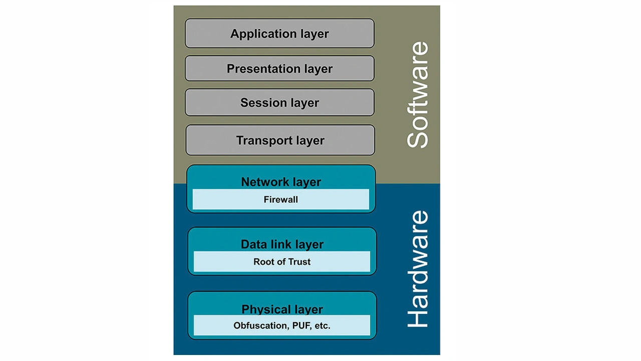 Dabei schützt die Bitübertragungsschicht (Physical Layer) vor Manipulation, die Sicherungsschicht (Data Link Layer) validiert die gesamte Hardware und Software beim Booten und die Vermittlungsschicht (Network Layer) ist eine Hybridschicht (HW/SW), die die Ausnutzung von Softwareschwachstellen verhindert sowie die Integrität und Vertraulichkeit sicherstellt (Bild 1).