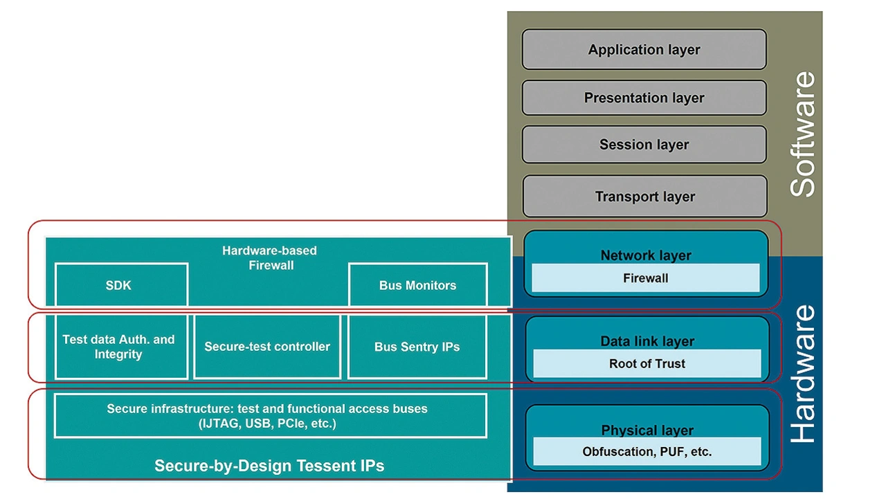 Diese IP bietet Flexibilität und Konfi-gurierbarkeit, um zusätzlich zu dedizierten Hardwaremonitoren eingesetzt zu werden. Das beschleunigt den Prozess und entlastet gleichzeitig den Hauptprozessor um zeitaufwendige Firewall-Aufgaben. Tessent Embedded Analytics deckt die Bitübertragungs- (Physical Layer), Sicherungs- (Data Link Layer) und Vermittlungsschicht (Network Layer) ab (Bild 2).