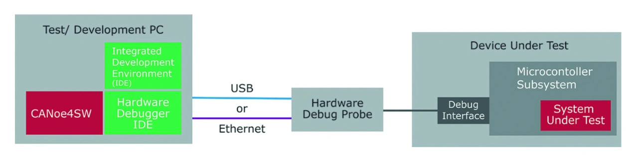 Die neue Hardware-Debugger-Anbindung ist sowohl in der aktuellen Version von CANoe4SW als auch in CANoe verfügbar und bietet die reibungslose Testkommunikation über einen Hardware-Debugger. Hierfür wird die Verbindung der Hardware Debug Probe zum Testcomputer über USB oder Ethernet genutzt.
