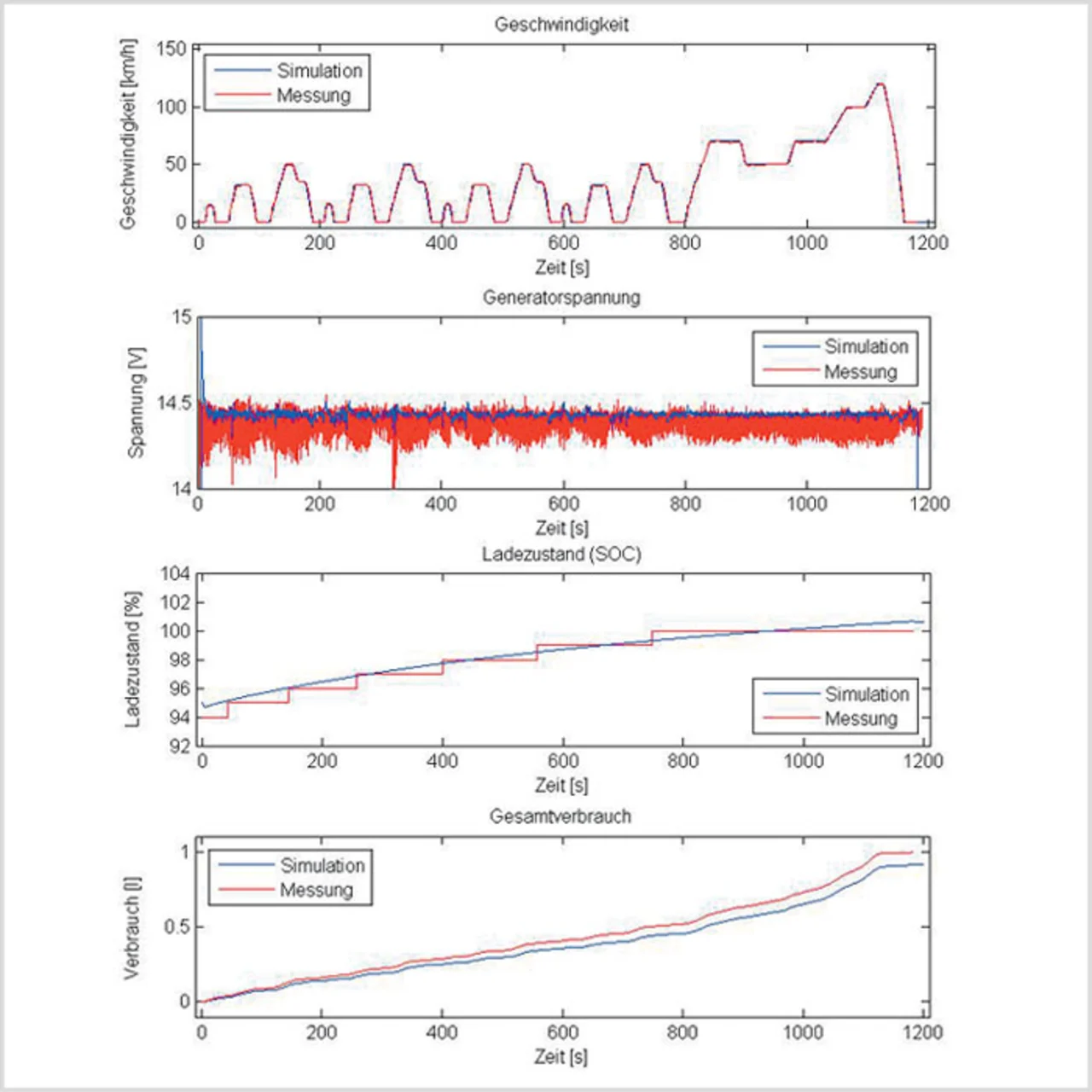 Den Diagrammen in Bild 3 ist zu entnehmen, dass die Messwerte der Generatorspannung und des Batterieladezustands annähernd den gleichen Kurvenverlauf zeigen wie die Simulationswerte. Bei der Bestimmung des Kraftstoffverbrauchs ist eine kleine Abweichung erkennbar. Die Umrechnung des Simulationsergebnisses ergibt einen Verbrauch von 8,27 l/100 km. Bei der Messung wurde ein Verbrauch von 8,69 l/100 km ermittelt.