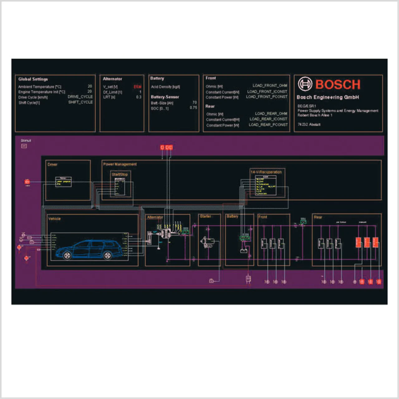 Im Rahmen der Bordnetz-Auslegung wird eine Vielzahl von Simulationen ausgeführt, die die „Worst- Case“-Situationen nachstellen. Kommen nun auch noch Variationen des Generators und der Batterie hinzu, so entsteht eine große Zahl von Einzelsimulationen. Hilfreich ist hier eine Simulationsautomatisierung, die zum einen die vielfältigen Eingangsgrößen als auch die Ergebnisse handhabt. Mittels einer Datenbank werden die verschiedenen elektrischen Verbraucher und weitere Daten der Plattformen/ Fahrzeuge verwaltet, die für eine Gesamt- Systemsimulation benötigt werden.