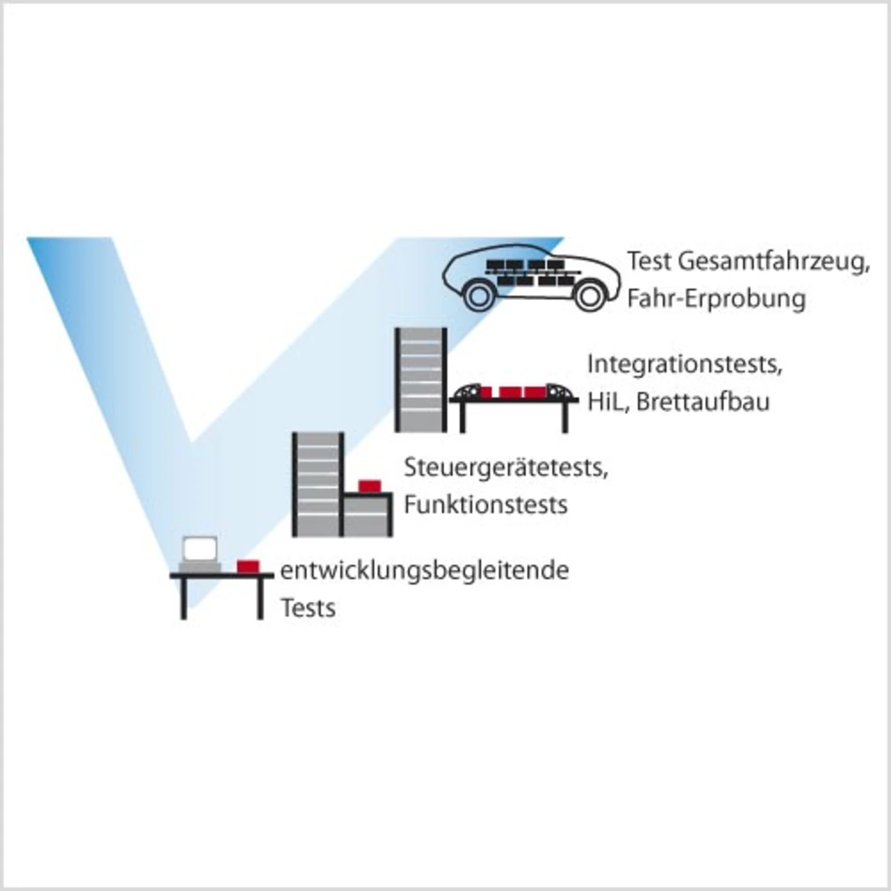 Elektronik und Software sind im Automobil zu unverzichtbaren Bestandteilen geworden. Die Verifikation der Entwicklungsergebnisse umfasst deshalb nicht nur die mechanischen Systeme, sondern auch die elektronischen Steuergeräte und deren Software. Die Komplexität der stark vernetzten Systeme stellt dabei hohe Anforderungen an den Testprozess und die Testwerkzeuge. Systematische und umfassende Tests sind in allen Entwicklungsphasen notwendig. Dabei werden in der Entwicklung unterschiedliche Testverfahren genutzt (Bild 1). Vor den klassischen Testläufen mit vollständig aufgebauten Versuchsträgern in der Fahr-Erprobung und den Integrationstests am Brettaufbau werden die Steuergeräte zuerst einzeln in den Funktionstests geprüft.
