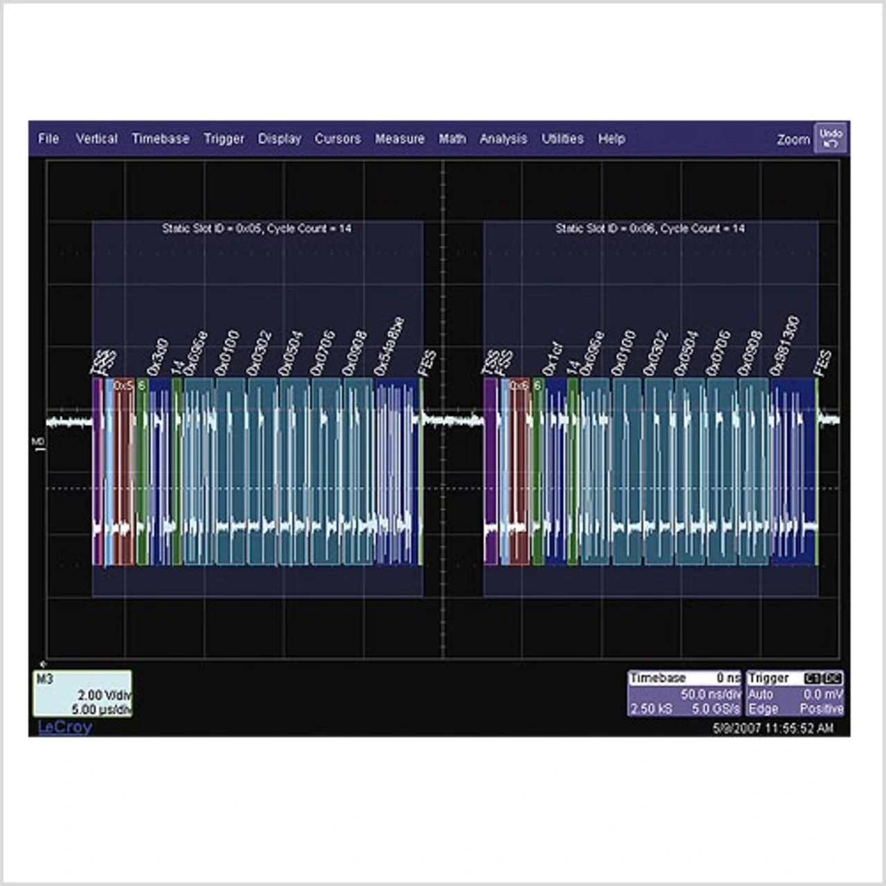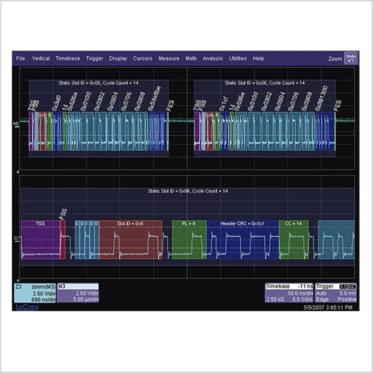 Während sich bei Anbietern von Messlösungen an seriellen Bussen die Einsicht durchgesetzt hat, Signal und dekodierte Protokollinformationen auf einem Bildschirm anzuzeigen, geschieht dies jedoch meist höchst unübersichtlich – entweder ist das Signal oder die Dekodierung schlecht zu erkennen, gelegentlich auch beides. LeCroy nutzt die Möglichkeiten moderner Displays und hoher Rechenleistung: Mit Hilfe spezieller Algorithmen zerlegt »Flex- Ray TD« das serielle (physikalische) Datensignal und stellt die dekodierten Protokollinformationen farbig dar, der Beginn des Kommunikationszyklus und Fehler- Frames sind hervorgehoben.