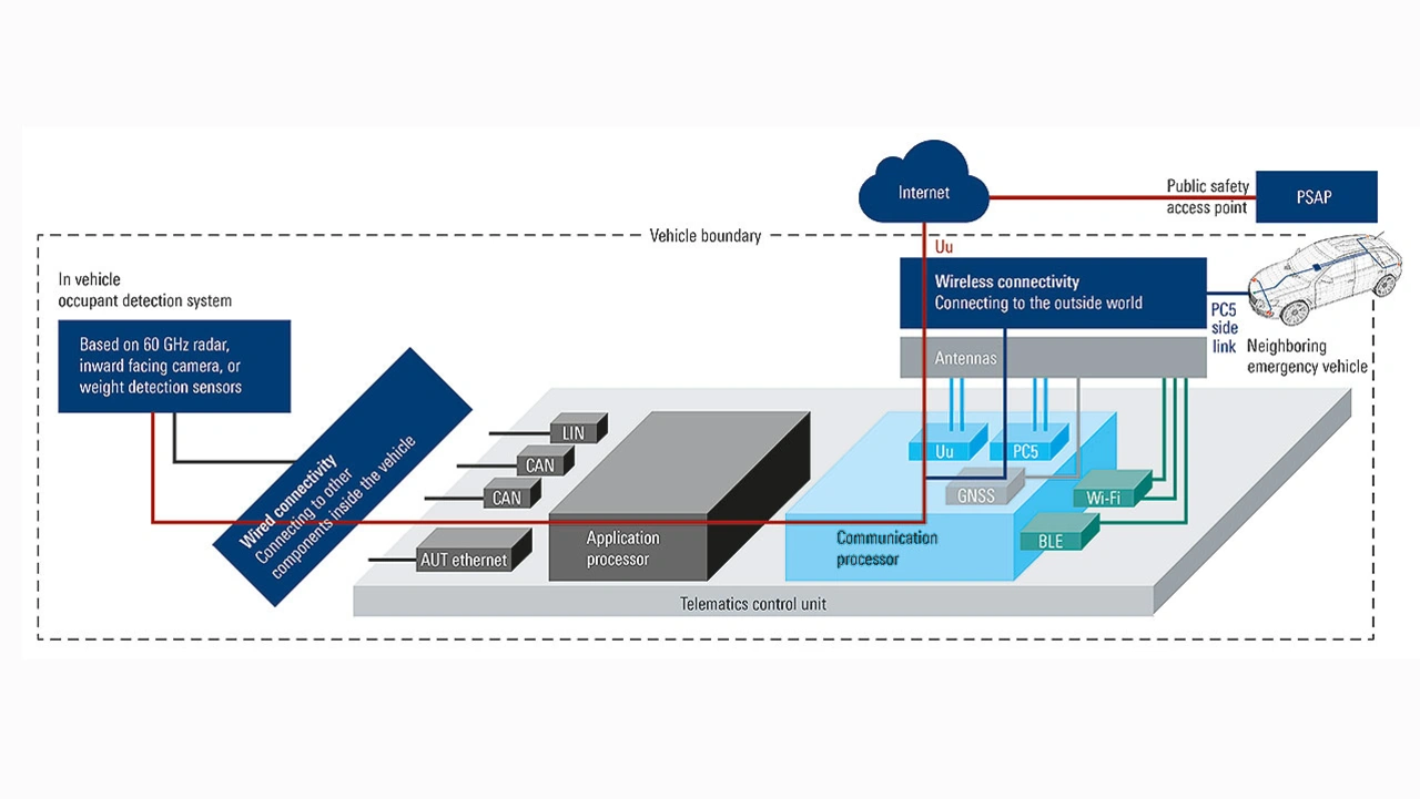 Die TCU ist mit mehreren Wireless-Technologien ausgestattet, damit das Fahrzeug mit der Außenwelt kommunizieren kann (Bild 1). Außerdem ist sie über Kabelverbindungen (Automotive Ethernet, CAN-Bus) mit verschiedenen Komponenten im Fahrzeug, wie zum Beispiel anderen elektronischen Steuergeräten und Domain Controllern, verbunden.