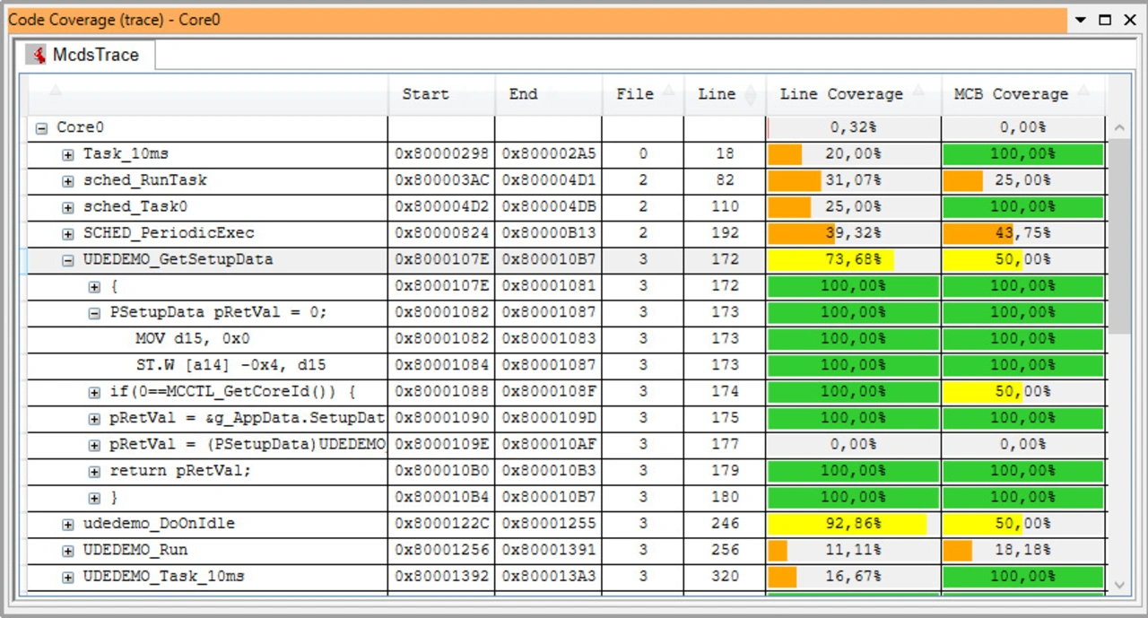 Umfangreicher und leistungsstärker präsentieren sich außerdem die Code-Coverage-Funktionen der UDE 2021. Zum Berechnen der Code Coverages greift die UDE ausschließlich auf Trace-Informationen zurück. Ein Vorteil gegenüber anderen Verfahren besteht darin, dass Entwickler gänzlich ohne Instrumentieren des zu testenden Codes auskommen. Somit ist die gesamte Code-Coverage-Analyse nicht-invasiv, beeinflusst das Laufzeitverhalten der Anwendung also zu keiner Zeit. Alle Code-Coverage-Ergebnisse werden in kompakter Form für alle berechneten Coverage-Level präsentiert und sind, ausgehend von der Funktionsebene bis hin zu einzelnen Instruktionen auf Objektcodeebene übersichtlich darstellbar.