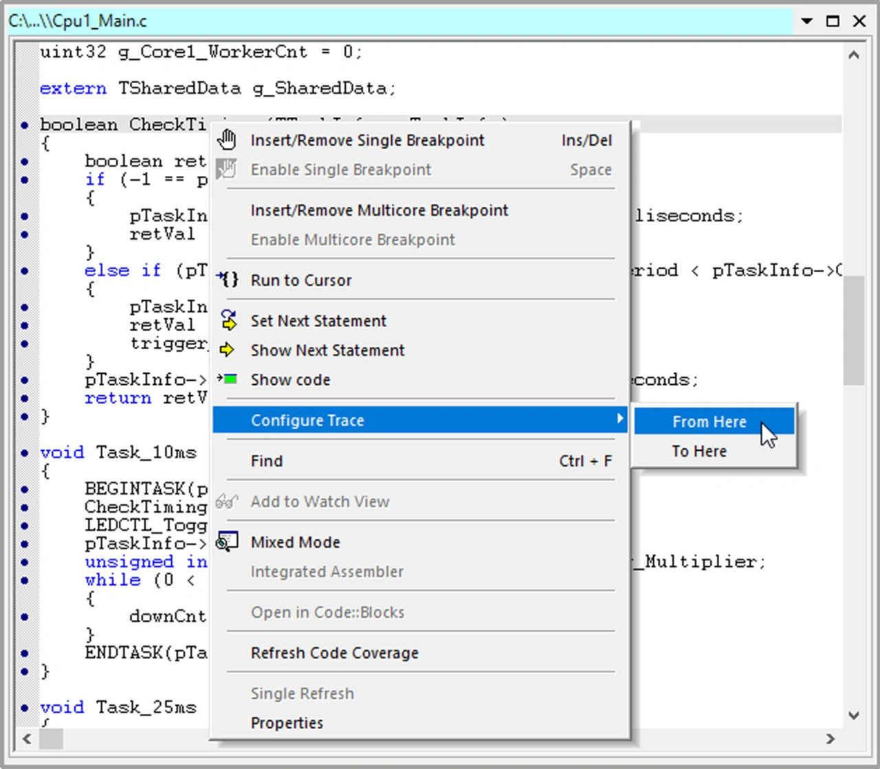 Das UDE SimplyTrace-Feature vereinfacht diesen Prozess, indem Trace-Funktionen von typischen Anwendungsfällen übernommen und kontextsensitiv an die verschiedenen Debugger-Ansichten angehängt wurden. So kann beispielsweise die Trace-Aufzeichnung direkt aus dem Quellcode-Fenster heraus für die Anwendungsfälle »Trace from source code line« oder »Trace to source code line« konfiguriert werden.