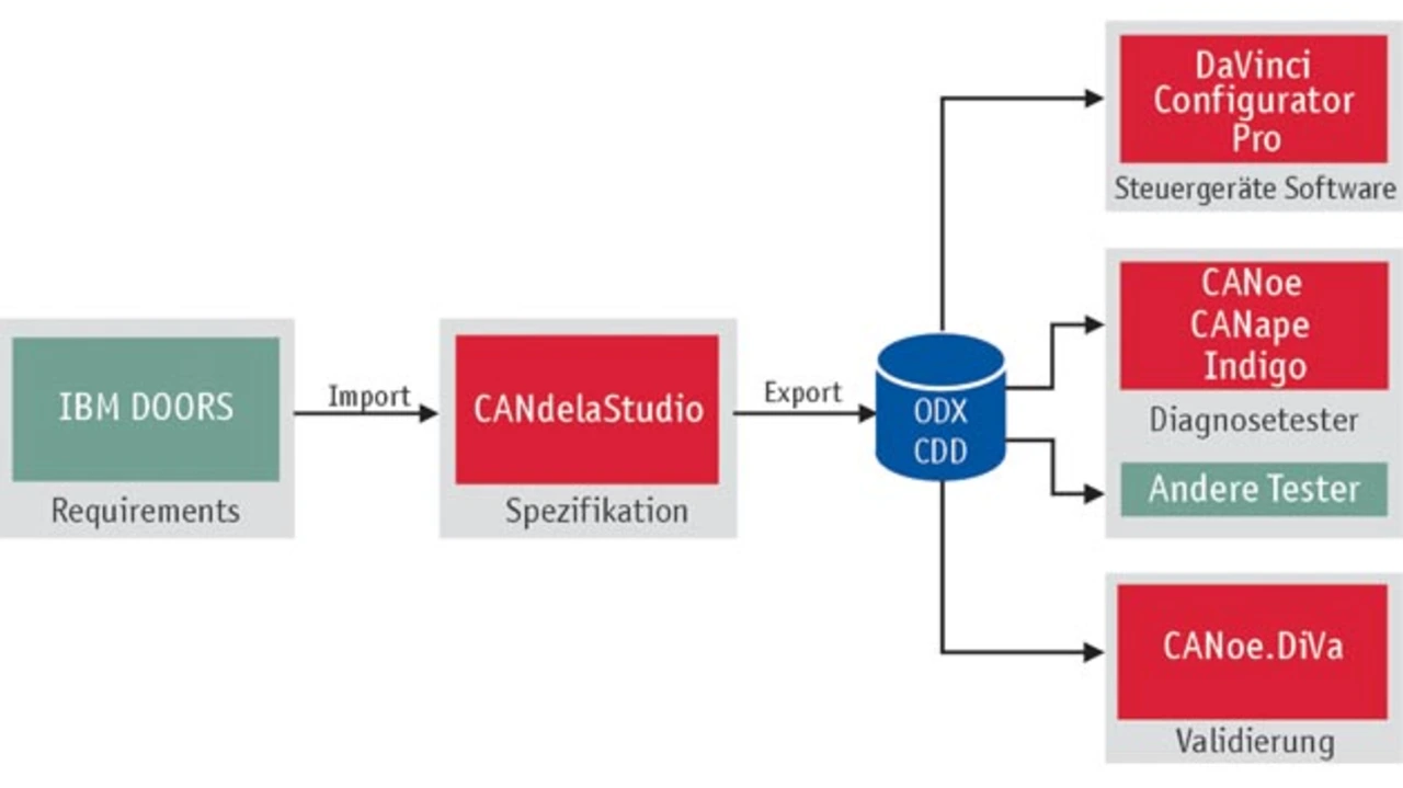 Als Diagnosetester werden je nach Einsatzgebiet CANoe, CANape oder Indigo genutzt. Weil die Testerparametrierung und die Steuergerätekonfiguration ihren gemeinsamen Ursprung in der CANdelaStudio-Spezifikation haben, ist sichergestellt, dass Tester und Steuergeräte-Software zueinander passen.