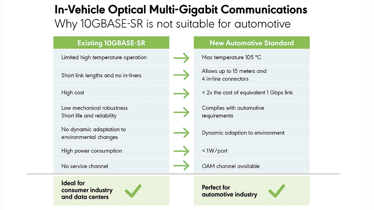 Optimal wäre es, wenn ein bestehender Standard auch für Automobilanwendungen funktionierte. Allerdings wurde der IEEE-Standard 10GBASE-SR nicht für die strengen Anforderungen in Fahrzeugen entwickelt. Er ist für die Anforderungen von Rechenzentren geschaffen, in denen Temperatur, Lebensdauer, Preis, Zuverlässigkeit und mechanische Robustheit moderate Anforderungen stellen und sehr gut kontrollierbar sind.