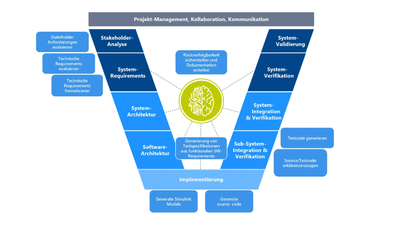 Entlang des gesamten Entwicklungsprozesses lassen sich Anwendungsfälle im Engineering finden – dargestellt im V-Modell in Bild 1. Dies beginnt mit der Erstellung von Anforderungen, führt über Review, Verfeinerung und Verlinkung von Anforderungen bis hin zu einer Formalisierung, zum Beispiel in der Form von RiL [1]. In der Implementation kann nicht nur Code sondern auch beispielsweise Simulink-Modelle erzeugt werden. Auch Testfälle können aus Anforderungen und Code erzeugt werden. Auf zwei Use Cases soll im Folgenden genauer eingegangen werden.