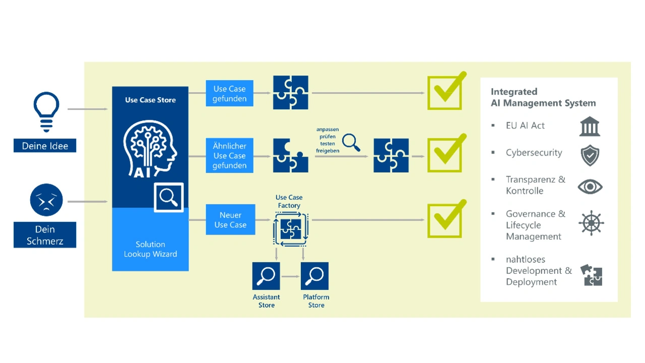 Unternehmen müssen agil auf die raschen Entwicklungen im KI-Bereich reagieren, indem sie effektive Use Cases identifizieren, entsprechend die Toolwelt beobachten sowie ihre Eigenentwicklungen koordinieren. Dabei ist es entscheidend, permanent die Einhaltung des AI Acts und weiterer Regularien sicherzustellen. Durch die Inventarisierung und Priorisierung von KI-Use Cases wird sichergestellt, dass sowohl Unternehmensziele als auch rechtliche Vorgaben eingehalten werden können und Mitarbeitende schnell die richtigen Lösungen für ihre Anwendungsfälle zur Verfügung haben. Hierfür kann ein schlanker KI-Management-Prozess wie in Bild 3 genutzt werden.