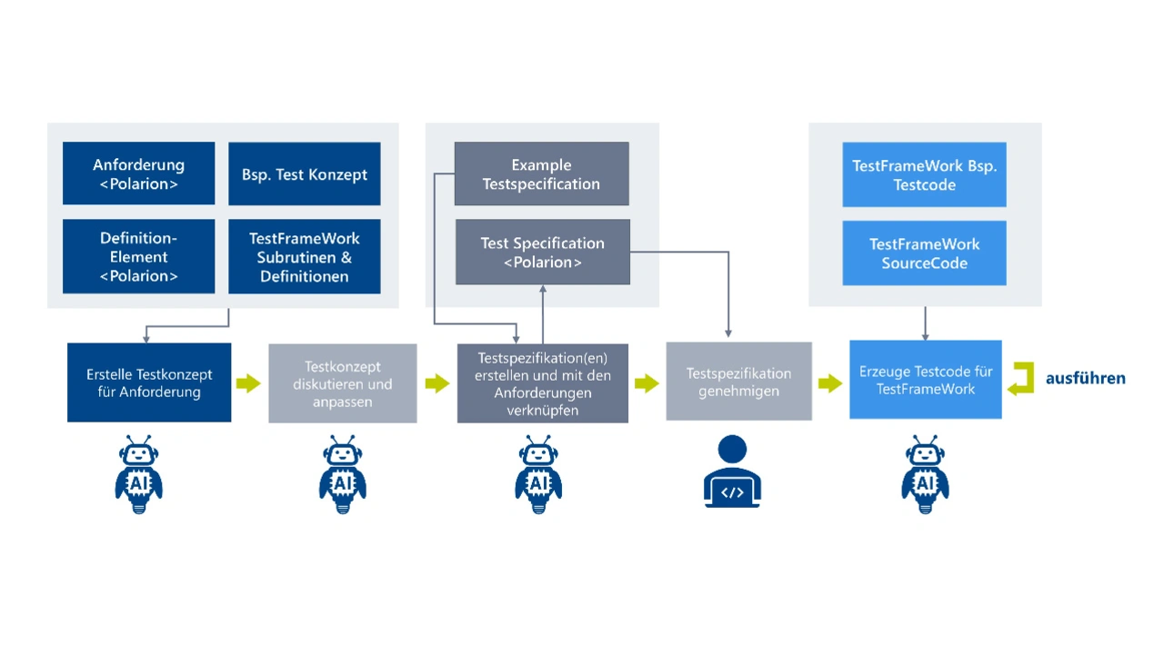 Die Verbindung zu Polarion stellt sicher, dass inhaltliche Anforderungen korrekt eingebunden werden. Bild 2 zeigt die definierten Schritte des gesamten Prozesses sowie diejenigen Stellen, an denen der menschliche Bearbeiter mit fachlicher Expertise die Entscheidung zur Korrektur oder Fortführung trifft: