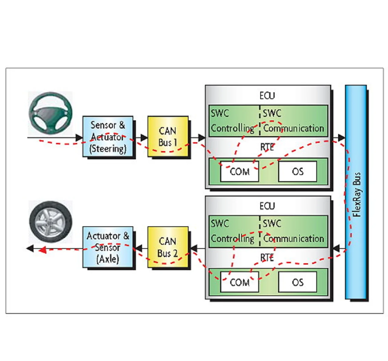 In TIMMO haben die OEMs und Tier- 1-Zulieferer insgesamt fünf Validatoren aufgebaut. Dabei kommen verschiedene Werkzeuge zum Einsatz, darunter die Symtavision-Werkzeuge TraceAnalyzer zur Auswertung von Messungen und SymTA/S zur Vorhersage, Optimierung und Absicherung der Echtzeit- Fähigkeit. Dazu wird großteils automatisch ein initiales Timing- Modell aus Traces an vorhandenen Steuergeräten erzeugt. Dieses Modell wird dann um neue Software- Funktionen oder Kommunikationswege ergänzt. Weiter können verschiedenen Änderungen am System virtuell vorgenommen und so „Was wäre wenn“-Vorhersagen getroffen werden. Die Validatoren konzentrierten sich im Wesentlichen auf die Entwurfsund Implementierungsphase der TIMMO- Methodik, wobei einzelne Validatoren auch Teile der Fahrzeug- und Systemdefinition sowie der Testphase und die Anwendbarkeit von TADL untersuchten. Beim ersten Validator handelt es sich um ein Antiblockiersystem (ABS) von Volvo. Volvo hat umfangreiche Analysen von Wirkketten mit Sym- TA/S durchgeführt und damit Event- Constraints und DelayConstraints einer komplexen Software-Architektur abgesichert. Der zweite Validator der Universität Paderborn implementierte ein Steer-by-Wire-System mit aktiver Stoßdämpfung. Auch hier kam Sym- TA/S zum Einsatz, in diesem Fall für die Software und die verteilte Bus- Kommunikation entlang der gezeigten Wirkketten (Bild 5). Besonderes Augenmerk wurde dabei auf die Synchronisation zwischen den ECUs und dem FlexRay-Bus bzw. den Sensoren gelegt.