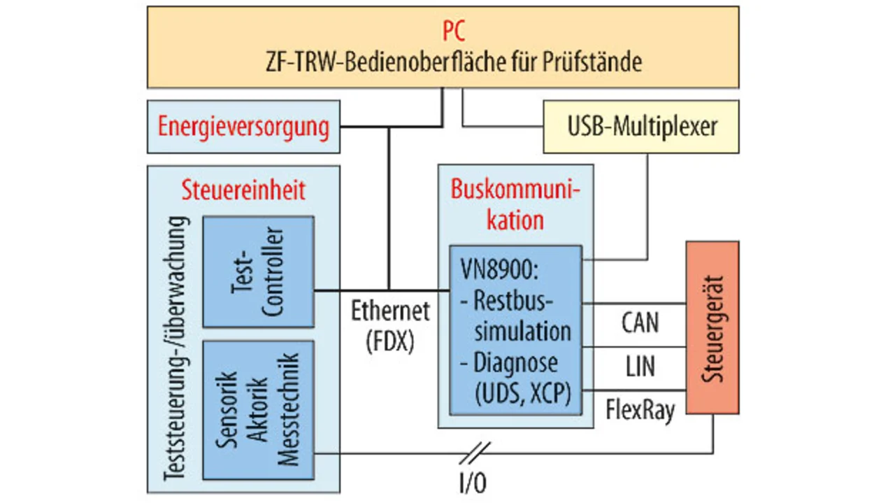 Heute sind Test Controlling, Visualisierung und Kommunikation zum Steuergerät streng getrennt. Das VN8900-System kommuniziert mit einem Linux-basierten Leitrechner von Smart Testsolutions über die LAN-Schnittstelle. Dabei kommt ein spezielles, von Vector mitgeliefertes, echtzeitfähiges Ethernet/UDP-Protokoll mit der Bezeichnung FDX (Fast Data Exchange) zur Anwendung. Durch eine enge Zusammenarbeit mit Vector Informatik war ZF TRW in der Lage, das FDX-Protokoll nach eigenen Vorstellungen zu modifizieren, und konnte in diesem Rahmen beispielsweise einen Datenaustausch nach dem Fifo-Prinzip implementieren. Umgekehrt hat Vector bei der Weiterentwicklung des VN8900-Systems auch Ideen von ZF TRW aufgegriffen. FDX bietet nun weitreichenden Zugriff auf autonom laufende Tests und erlaubt neben dem Starten und Stoppen von Anwendungen etwa das Auslesen und Löschen von Fehler-Codes, das Lesen und Sichern von XCP-Variablen, das Beeinflussen der Restbussimulationen und vieles mehr.