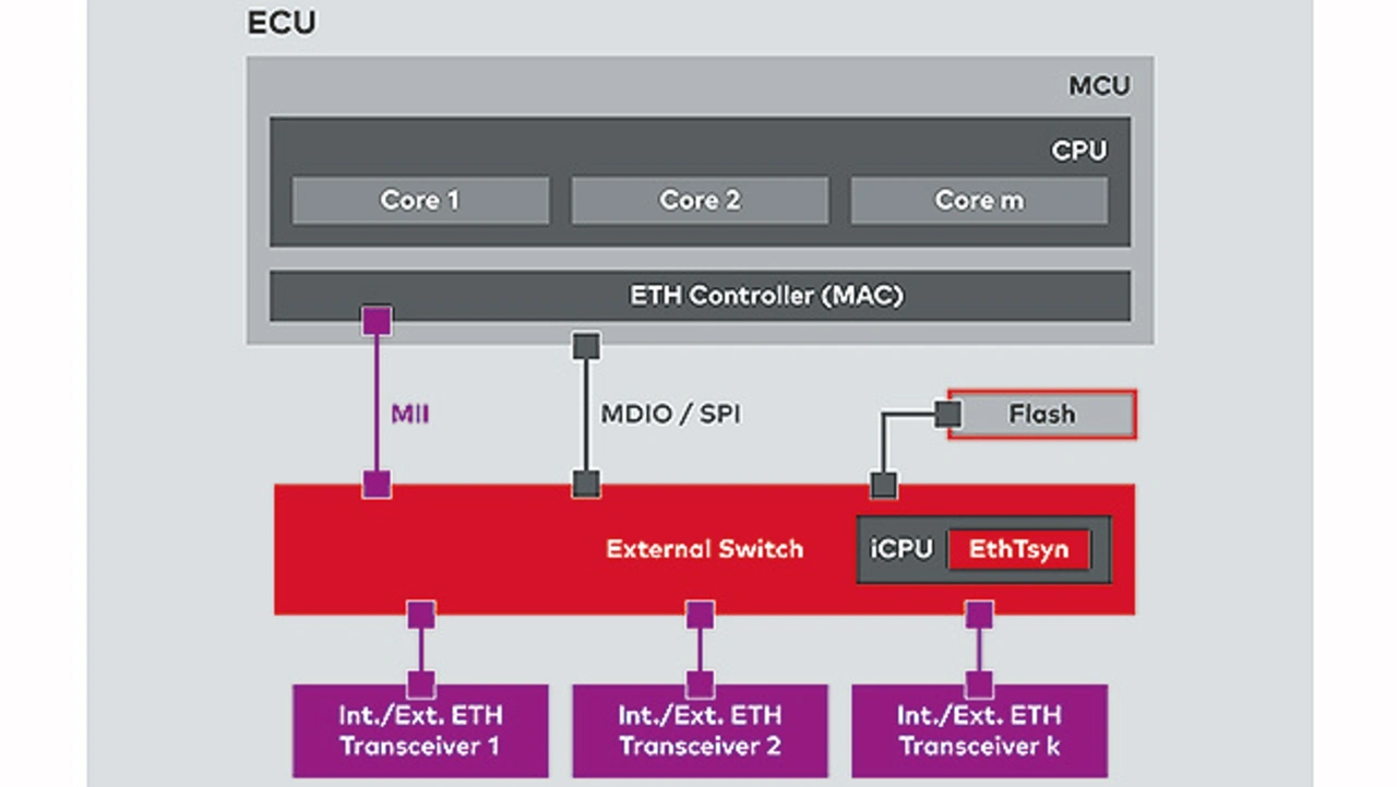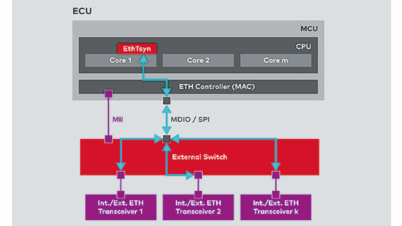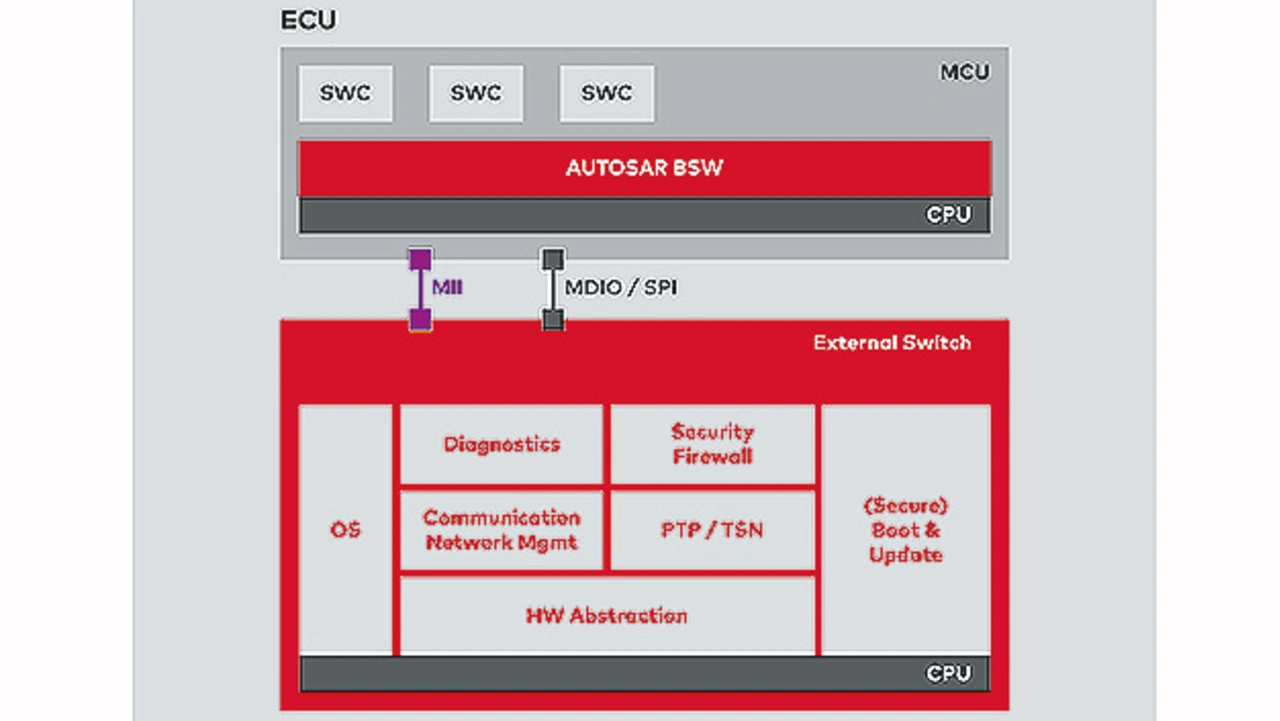 Aus Hardwaresicht ist ein Switch-IC ein Subsystem des Steuergeräts, das zusammen mit dem Mikrocontroller auf einer Leiterplatte platziert ist. Beim klassischen AUTOSAR-Ansatz läuft auf dem Mikrocontroller ein AUTOSAR-Stack mit einem Echtzeitbetriebssystem. Dieser Mikrocontroller verwaltet den Switch und dessen PHYs mittels Treiber via Management-Interfaces wie beispielsweise MDIO (Management Data Input/Output) oder SPI (Serial Peripheral Interface) und steuert den Switch wie ein Peripheriegerät (Bild 2).