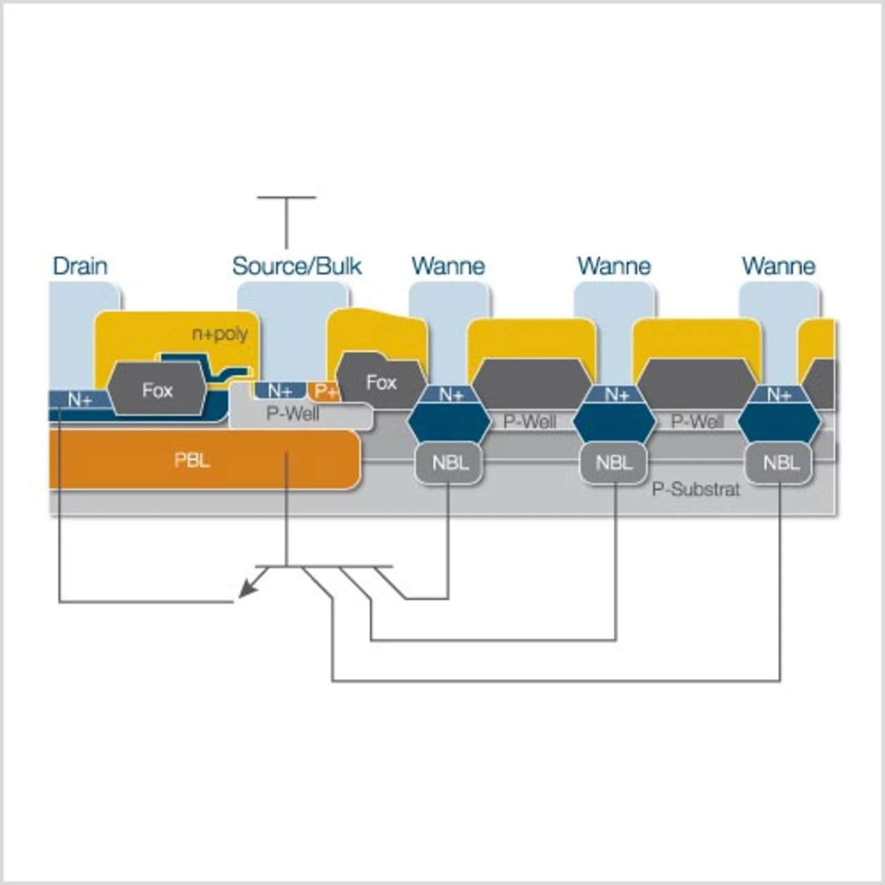 Bei diesen Tests zeigen vor allem Schaltkreise ihre Schwächen, die in einer Technologie entwickelt sind, bei der die einzelnen Bauelemente durch Sperrschichten isoliert sind. Hier hat sich ein Verfahren bewährt, das stattdessen auf eine Oxid-Isolation setzt: SOI (Silicon on Insulator). Der Vorteil dieser Technologie liegt auf der Hand: Durch elektromagnetische Einstrahlung überlagert ein hochfrequentes Signal das Bussignal, das auch negativere Werte als das Masse-Potential annehmen kann. Hierdurch werden parasitäre Transistoren, die sich an diesen Pins befinden, aktiviert und verursachen Störungen in weiten Bereichen der ICs (Bild 2).