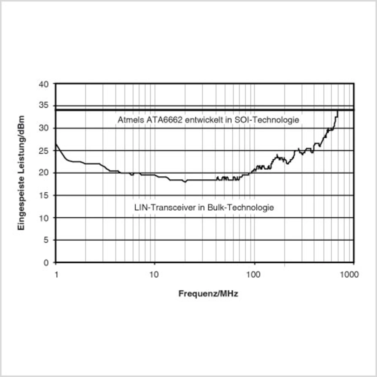 Die SOI-Technologie verhindert dieses Verhalten zuverlässig: Bedingt durch die Oxid-Isolation, gibt es keine parasitären Transistoren zu den Nachbarwannen. Dies zeigen auch DPITests von ICs, die in SOI-Technologie gefertigt wurden. Der LIN-Transceiver ATA6662 (Atmel) etwa zeigt bis zur Testgrenze von 34 dBm keine Ausfallerscheinungen (Bild 3).