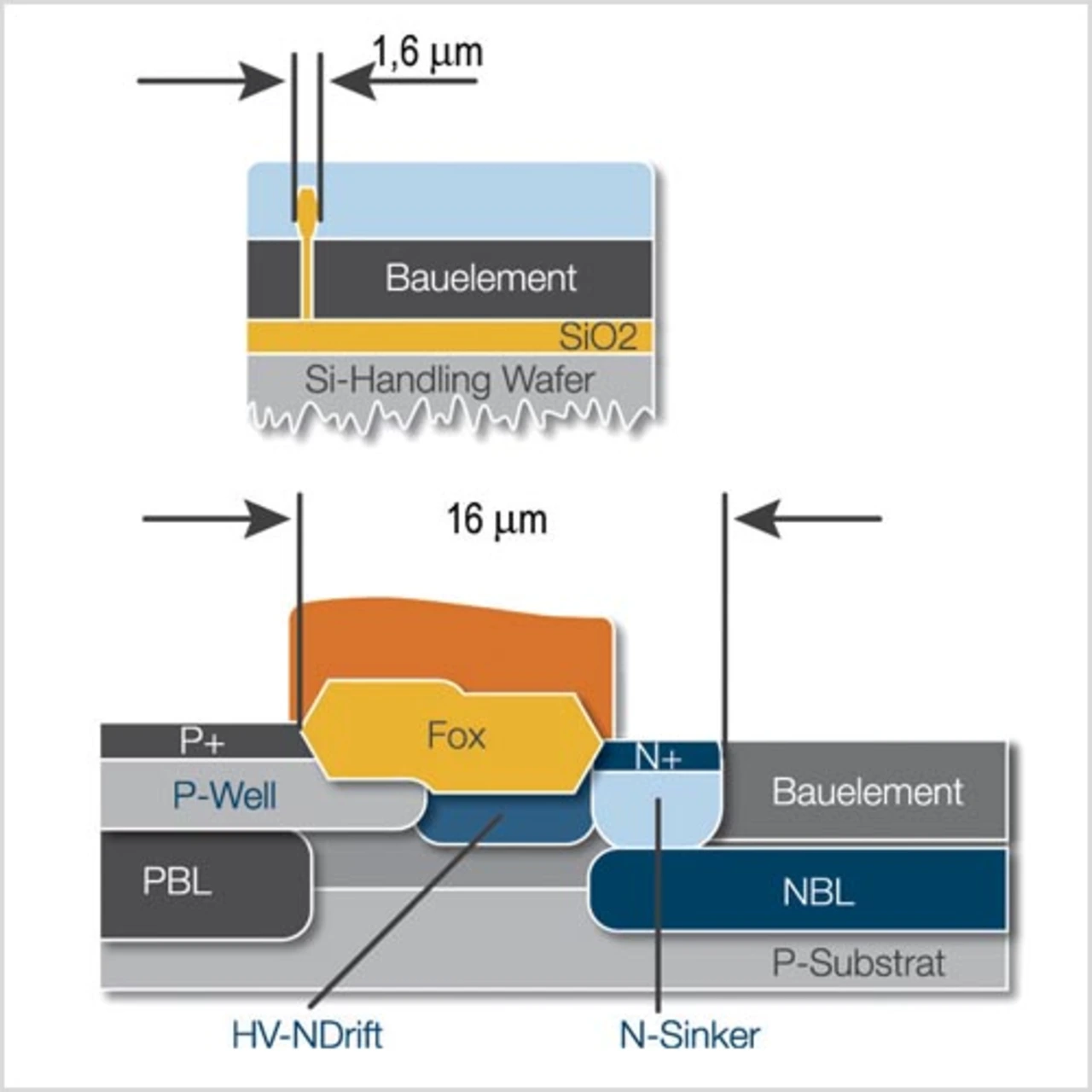 So kann etwa die flächenintensive Hochvolt-Isolation für Bauelemente, die für die Bordnetzspannung im Automobil geeignet sein müssen, durch einen einfachen schmalen „Trench“ im Oxid ersetzt werden (Bild 5). Dies ermöglicht eine deutlich höhere Packungsdichte für analoge Bauelemente und somit eine signifikante Flächeneinsparung.