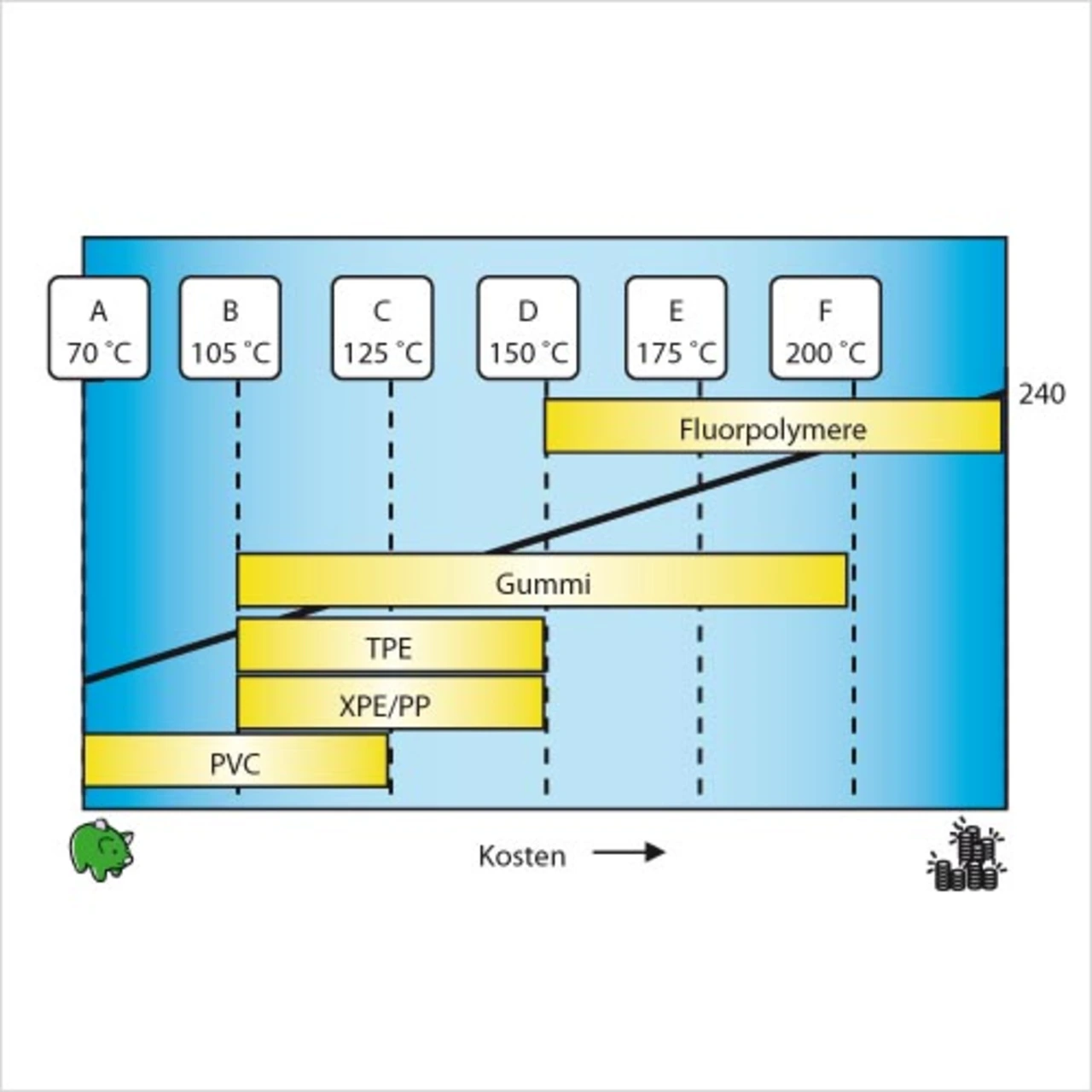Um leichtere und umweltfreundlichere Pkws zu bauen, werden die Temperaturen im Motorraum künftig höher ausfallen. In der Regel sind Leitungen in Motornähe auf bis zu 105 °C bei einer Betriebsdauer von 3000 Stunden ausgelegt, in kommenden Fahrzeugen werden 125 °C Standard sein. Die Kabelhersteller erarbeiteten daher etliche Lösungen in den Temperaturklassen bis 150 °C für eine bedarfsgerechte Auswahl und entwickeln weitere Materialien mit neuen Eigenschaften.