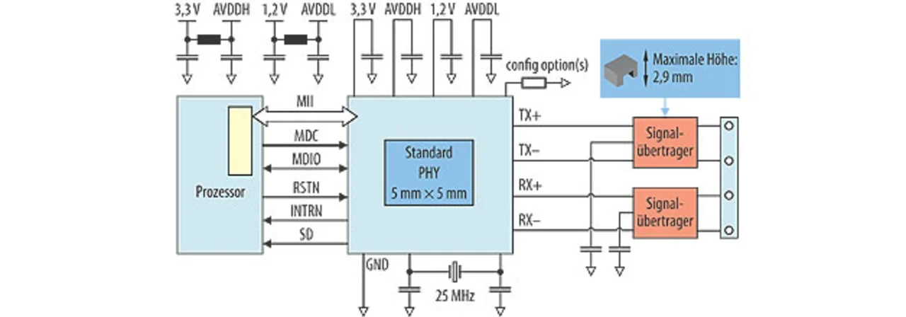 Ein zentraler Vorteil von Standard-Ethernet-Lösungen für Automobile besteht darin, dass für die Schnittstelle zwischen dem PHY-Transceiver und den für die Potenzialtrennung notwendigen Signalüberträgern nur wenige oder sogar gar keine Komponenten benötigt werden. Das vereinfacht das Layout und verbessert die Signalintegrität. Es können auch Standard-Ethernet-Signalüberträger verwendet werden. Die Verbreitung von Ethernet-Impulstransformatoren, die für Automotive-Anwendungen geeignet sind, ist in den letzten Jahren beträchtlich gestiegen, die Kosten entsprechend gesunken. Auch technisch hat sich einiges getan: Inzwischen werden Transformatoren mit einer Maximalhöhe von nur 2,9 mm angeboten, die perfekt für Anwendungen mit geringem Raum wie Kameramodule geeignet sind. Maschinengewickelte Signalüberträger bieten zudem eine verbesserte Genauigkeit gegenüber den traditionellen handgewickelten Impulstransformatoren.