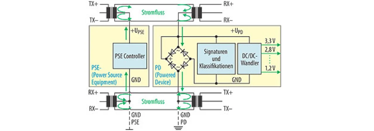 Die PoE-Spannung UPSE wird an die Mittenanzapfung des Standard-100BASE-TX-Ethernet-Transformators angelegt. Diese Technik wird als „Phantomspeisung“ bezeichnet. Ein großer Vorteil der Phantomspeisungsmethode ist die Gleichtaktstörungsunterdrückung auf der PD-Seite des Transformators. Auf dieser Seite ist ein Brückengleichrichter erforderlich, der den Strom richtet und unempfindlich gegenüber der Polarität ist, falls die RX- und TX-Leiterpaare versehentlich vertauscht werden.