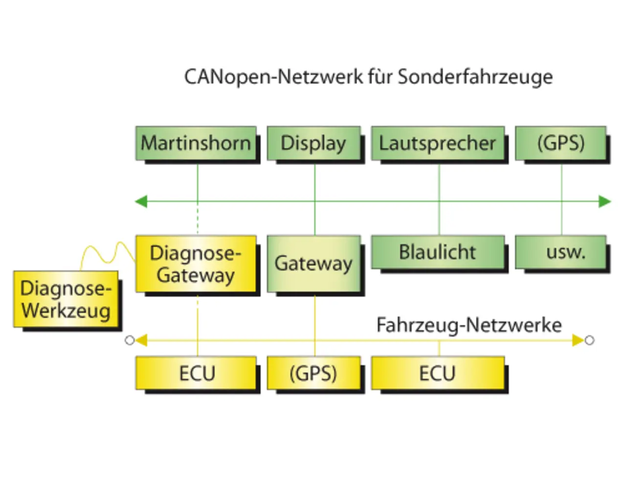 Für den Einbau von Geräten für Sonderfunktionen in einen Pkw ist die Ankopplung an dessen elektronische Steuergeräte (ECU) erforderlich. Dies bedurfte bisher Anpassungen für jeden Fahrzeugtyp; der Zugriff auf die ECUs war nur über herstellerspezifische Schnittstellen möglich. Ein neues Gateway spezifiziert nun den Übergang vom Pkw-Netzwerk auf das CANopen-Netzwerk der Zusatzgeräte.